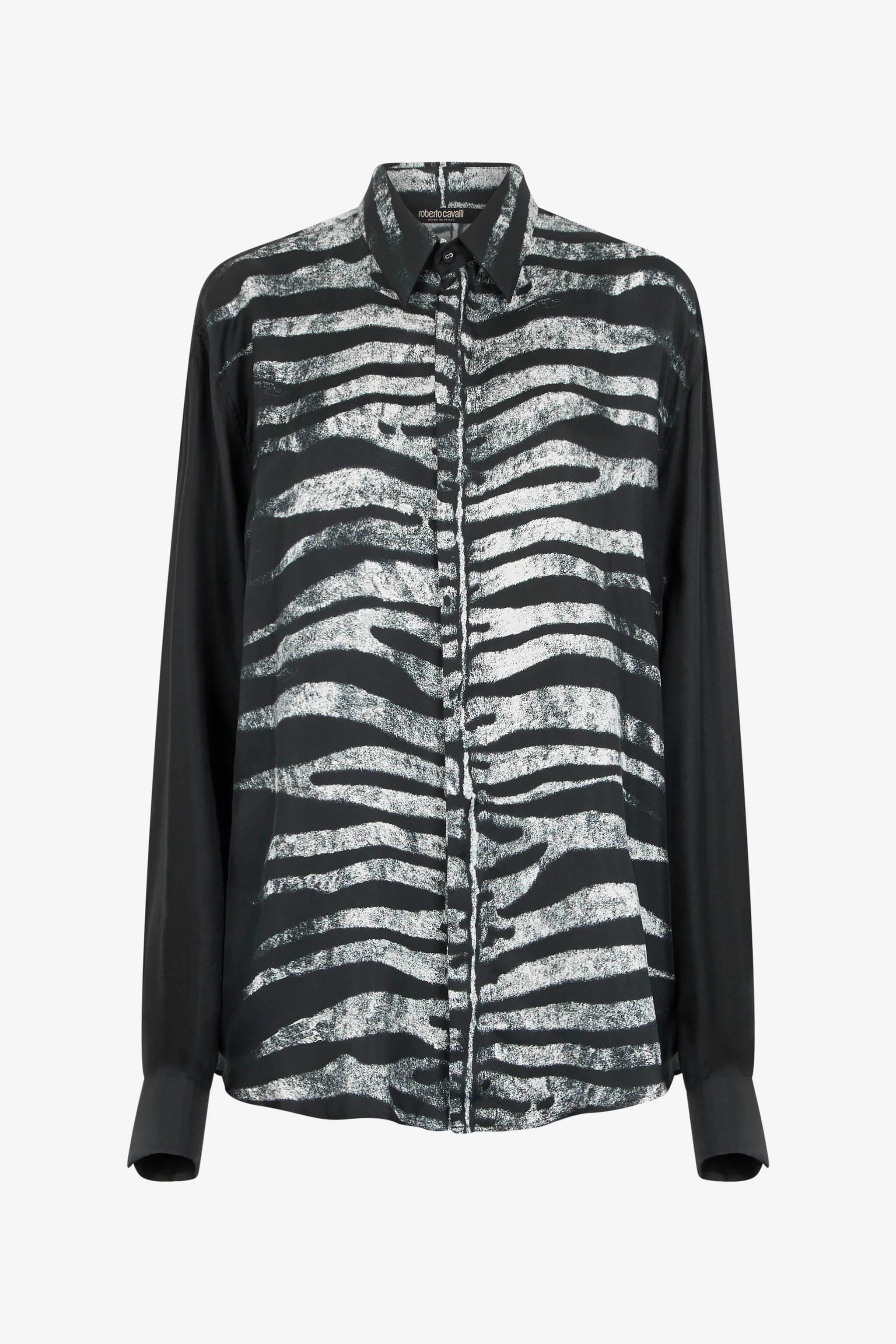 ID: URT714-4QN50-D0146 The animal universe is once again a source of inspiration for Roberto Cavalli and comes in this silk shirt with a bold Zebra print in a used version, ready to give a touch of wild sophistication to your everyday outfits. Details - Pure silk shirt - Used-effect Zebra print - Small Roberto Cavalli signatures - Long sleeves - Classic collar - Concealed front fastening with exposed top button - Roberto Cavalli label on the inside collar - Made in Italy Care & maintenance External fabric:100% Silk