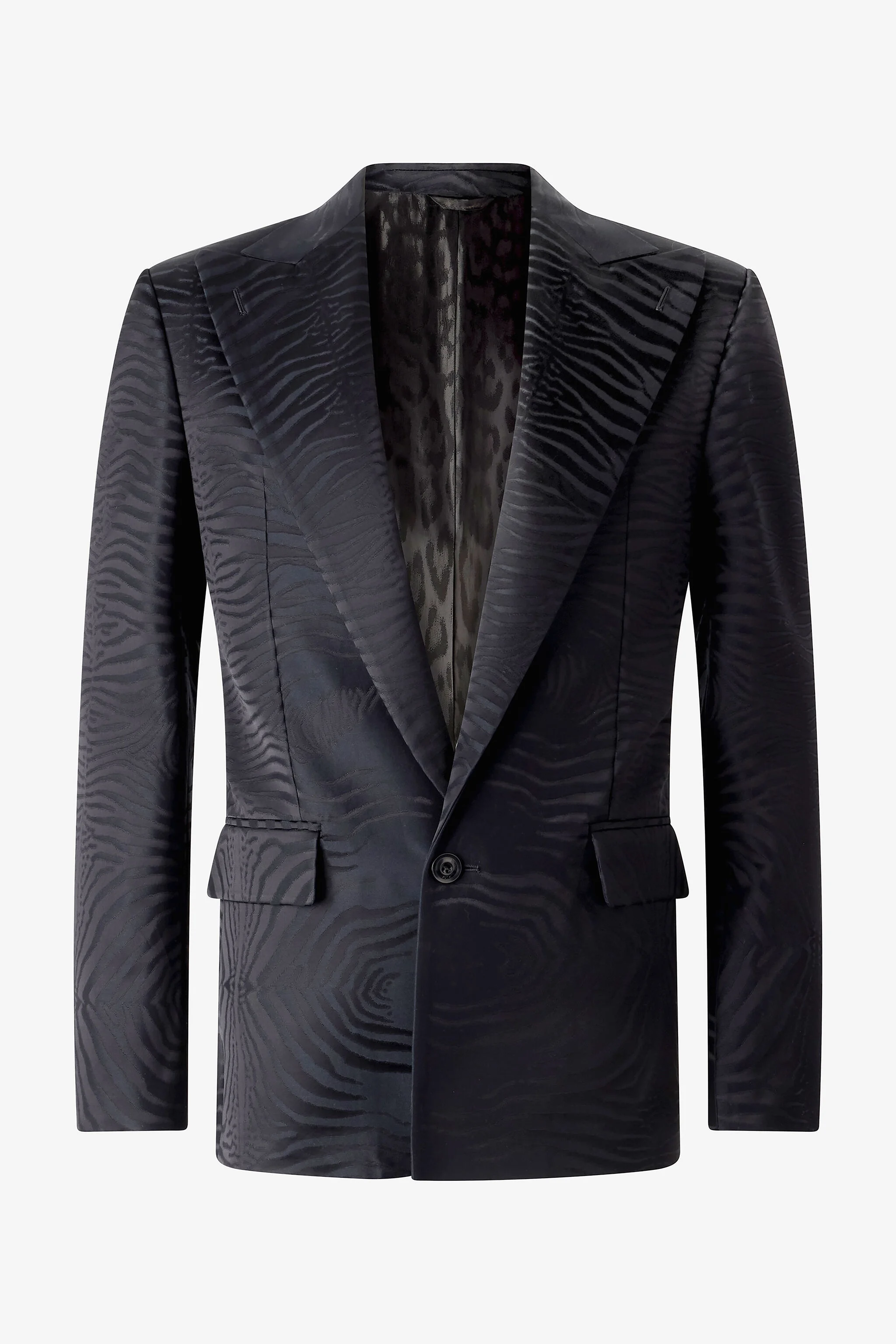ID: URT410-TJ033-05051 The wild elegance that has always set the Roberto Cavalli universe apart is reinterpreted in this men’s blazer through the striking Tiger Skin print that extends over the entire surface of the garment in the form of delicate solid-color embroidery, while the tonal Jaguar Skin print features on the lining. The garment features refined details, such as peak lapels, flap pockets on the front and a rear vent, and is finished with a metal button on the wrist encircled by a twisted snake, a further tribute to the animal world. Details - Blazer with solid-color Tiger Skin design - Lining with solid-color Jaguar Skin print - Inner hanger loop - Peak lapels - Single-breasted fastening with one button - Two front pockets with flap - Long sleeves - Cuffs with buttons, one of which is branded with a snake detail - Back vent Care & maintenance External fabric:50% Viscose / Rayon, 50% Cotton / Secondary fabric:50% Wool, 50% Viscose / Rayon / Lining:100% Viscose / Rayon