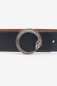 ID: URC001-PZU03-D0006 This belt by Roberto Cavalli is crafted entirely from solid-color leather with a timeless hammered effect, which is emphasized even more by the contrasting interior. The buckle, an homage to the reptilian universe, consists of a silver-tone snake with richly embellished scales that joins head and tail to form a circle. Details - Hammered leather belt - Snake-shaped buckle - Scales and embossed details - Silver-tone finish - Contrasting interior with leather lining Care & maintenance Leather - Fur:Bos Taurus / Lining:100% Bos Taurus