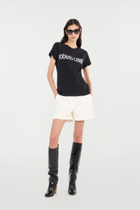 ID: UKT214-4NN53-09088 The wild elegance of the reptilian world, which has always been a source of inspiration for Roberto Cavalli, is fully expressed in these women's shorts featuring a delicate solid-color all-over python leather-effect print and embellished with a gold charm in the shape of the iconic Mirror Snake Monogram on the belt loop. Details - Stretch cotton shorts - Lined - All-over tonal python leather-effect print - Belt loops - Golden charm with Mirror Snake Monogram on a belt loop - One double-welt back pocket Care & maintenance External fabric:97% Cotton, 3% Elastane / Lining:55% Viscose / Rayon, 45% Polybutyleneterephthalate