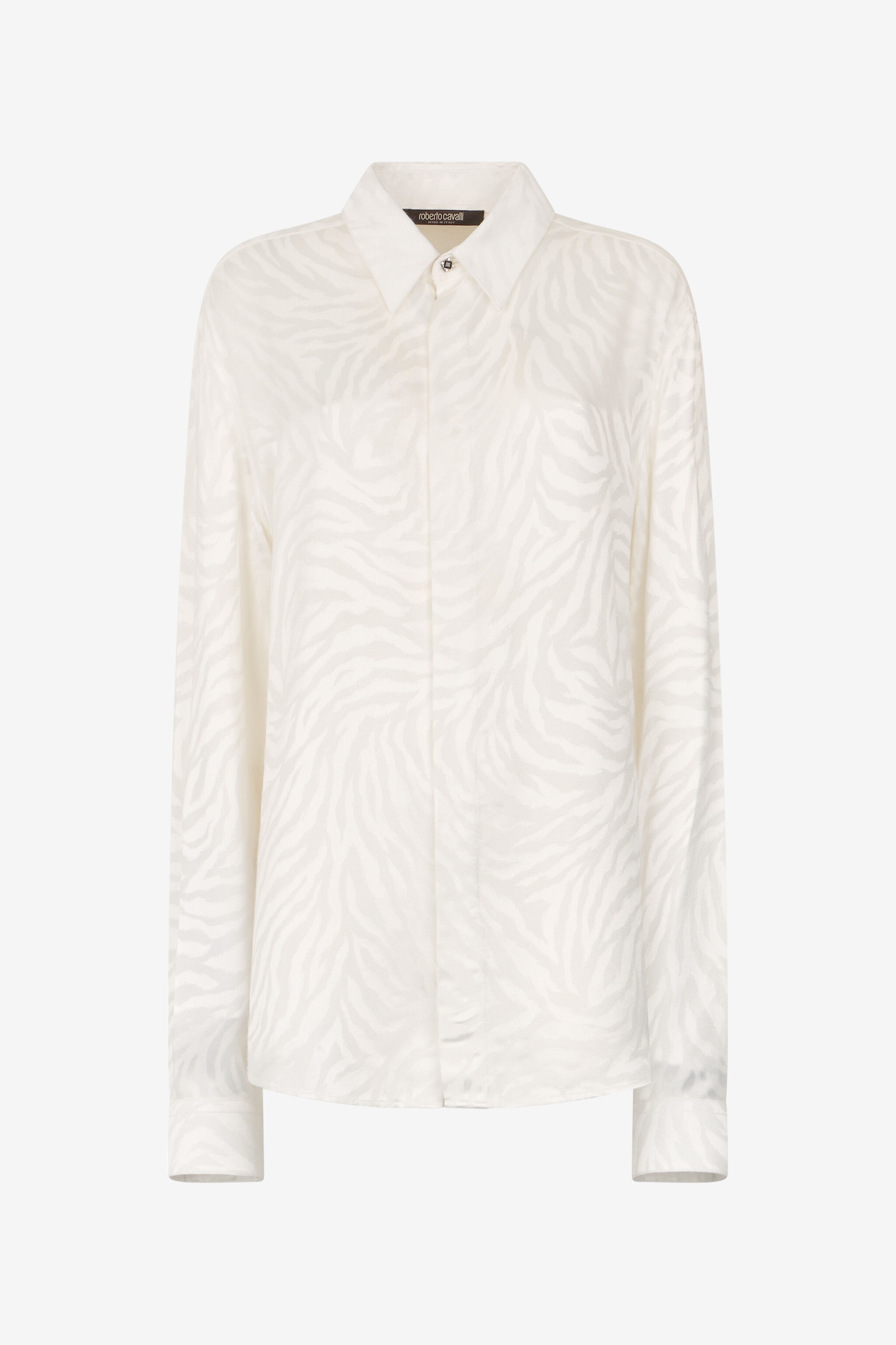 ID: URT700-DJ097-00052 A roaring all-over Tiger Skin print enlivens this long-line shirt, where the wild style of the animal print fades into the sober solid color of the garment. The model is embellished with a jewel button on the neck. Details - Long-design shirt - All-over tonal Tiger Skin print - Long sleeves - Classic collar - Concealed front fastening with exposed bejeweled button - Roberto Cavalli label on the inside collar - Made in Italy Care & maintenance External fabric:100% Viscose / Rayon