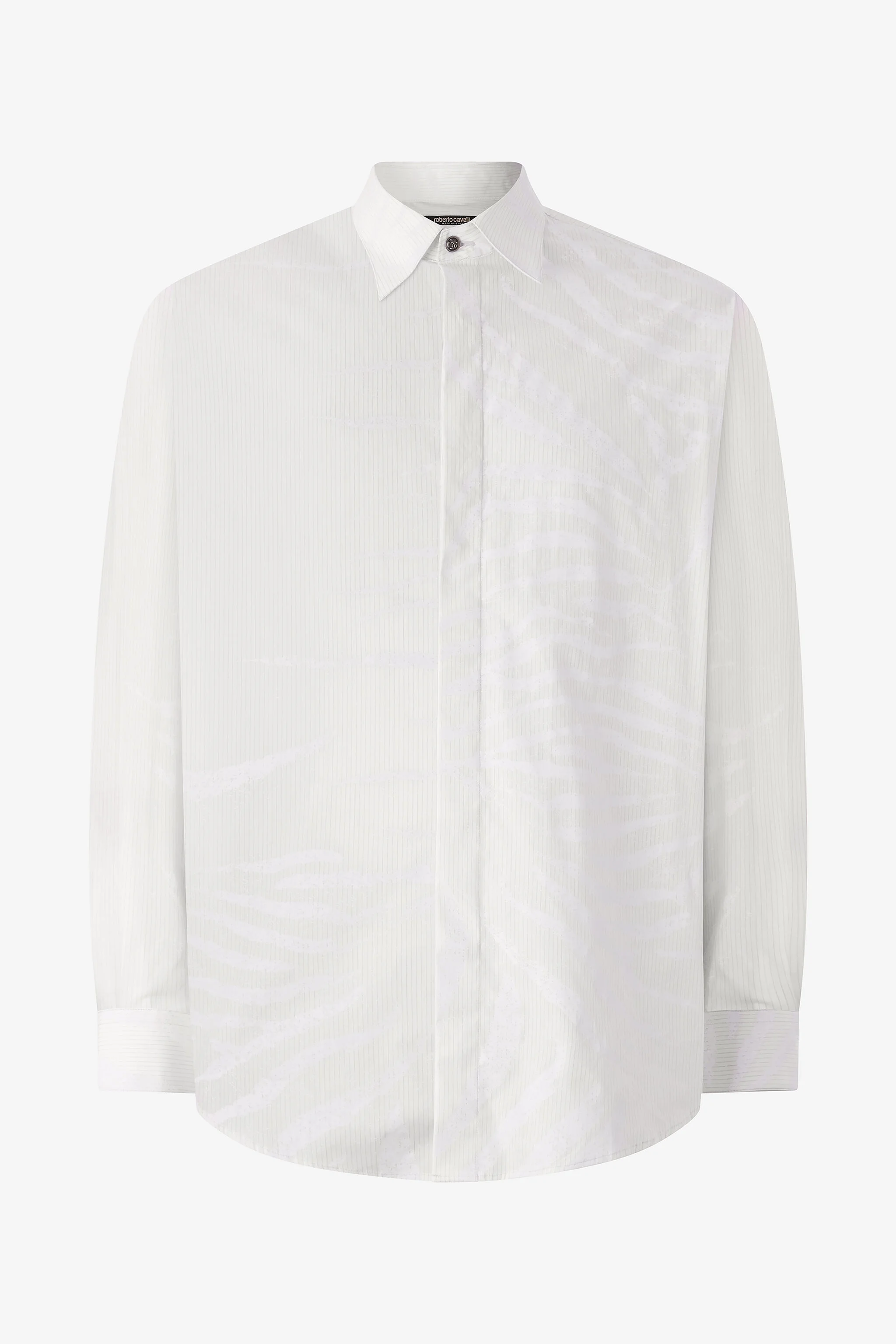 ID: URT720-CH105-Z0591 A roaring all-over Tiger Skin print decorates this pure silk shirt by Roberto Cavalli, where the wild style of animal print blends seamlessly with the subtle solid color of the garment, highlighted by a delicate vertical-stripe pattern. Details - Pure silk shirt - Micro-striped design with tonal Tiger Skin print - Classic collar - Long sleeves - Cuffs with double button - Concealed front fastening with exposed top button - Rounded hem - Roberto Cavalli label on the inside collar - Made in Italy Care & maintenance External fabric:100% Cotton