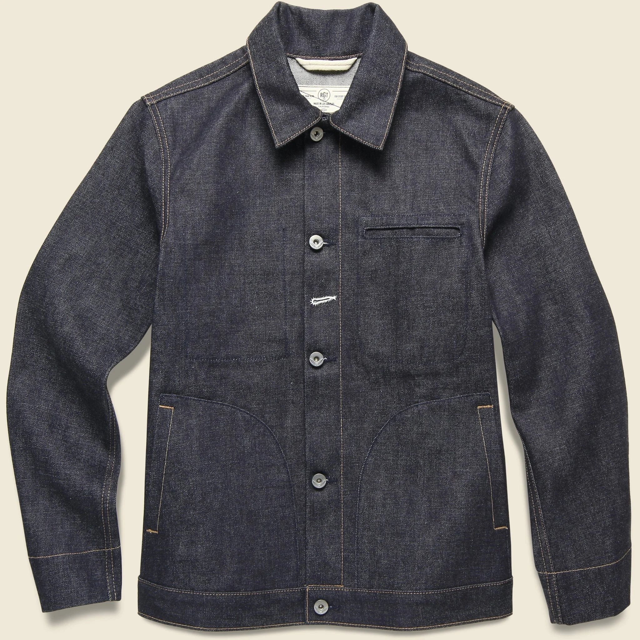 This Supply Jacket from Rogue Territory is cut from 15.25oz proprietary indigo Japanese selvedge denim woven with ring-spun yarns to give it a subtle vertical slub texture and great hand-feel. A modern take on the classic denim jacket, it’s got all the bells and whistles you’re used to like chainstitched seams for lasting durability, plenty of pockets and adjustable tabs at the waist for a custom fit. Wear it often and wash it never, this jacket is made to fade and made to last. - Modern take on the classic denim jacket - 15.25oz proprietary indigo Japanese selvedge denim - Signature indigo selvedge ID - Patch “hand-warmer” style pockets at the waist - Welt pocket at left chest - Chainstitched seams for durability - Placket and interior pocket cut on selvedge line - Interior pockets are clean finished with bias tape - Adjustable tabs on waistband - Raw nickel crossed feathers branded buttons - Slim fit that runs a little small - Expect up to .5” stretch in the shoulders and chest - We recommend taking one size up from your normal size Made in USA Materials: 15.25oz Japanese cotton selvedge denim The following measurements are for size Medium: Chest 39” | Shoulders 16 ½” | Sleeve 32” | Length 26 ½”