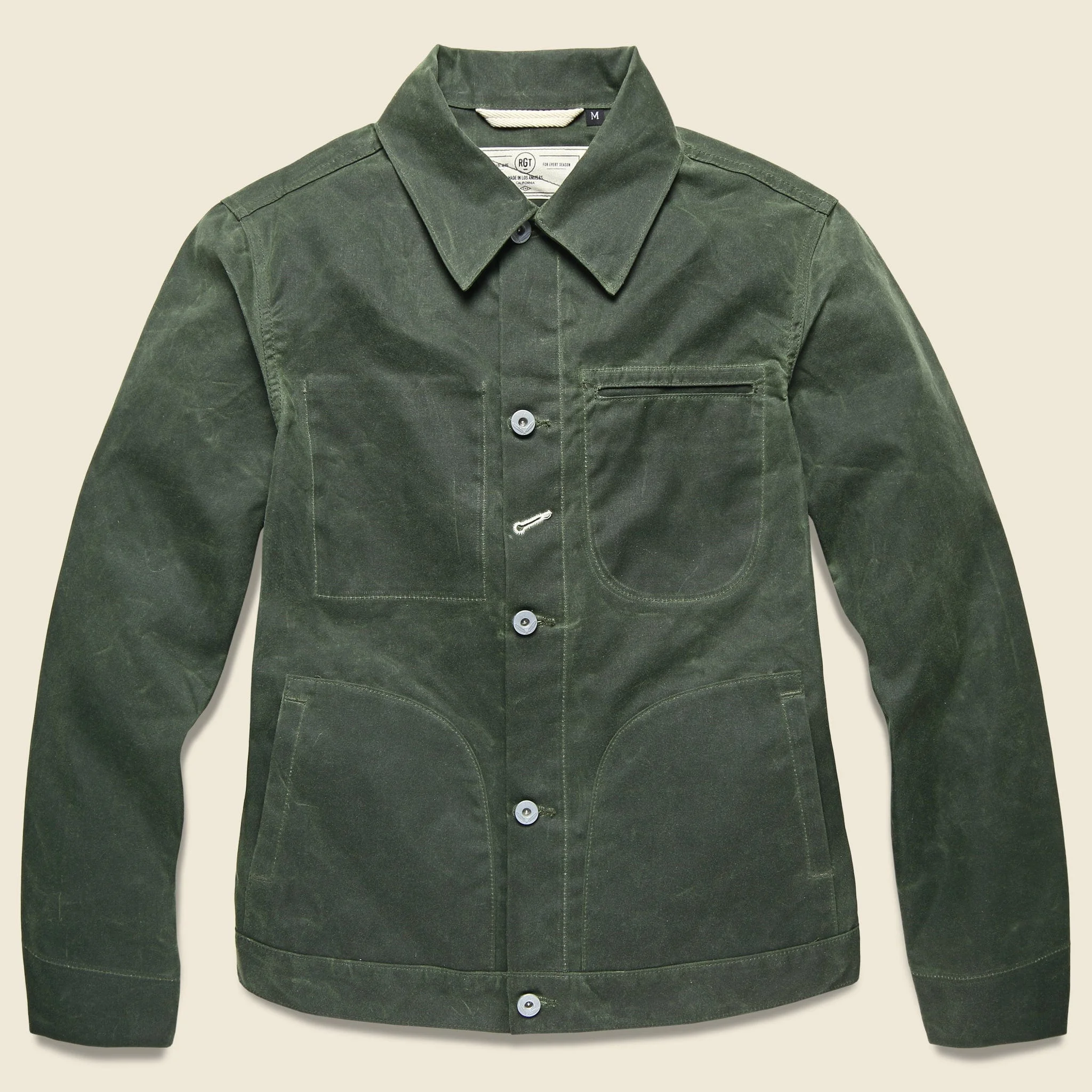 This Waxed Supply Jacket in Olive features all the hallmarks of the iconic tan version but in a classic army green & in a slightly lighter fabric weight. Designed and constructed in Los Angeles from 8.25 Martexin waxed canvas, this durable and highly water-resistant jacket is as at home in the woods as it is on the streets and only gets better with age. It runs small so we recommend sizing up one size from your usual jacket size. - 8.25 oz Martexin waxed canvas - Point collar and locker loop at collar base - Signature RGT keyhole on placket - Custom metal hardware - Internal pocket and two exterior handwarmer patch pockets - Welt pocket at left chest - Slim fit - Runs small. We recommend buying a size up. - You can expect up to 0.5″ in stretch in the shoulders and chest - See exact measurements for all sizes in size guide above. - Made in Los Angeles, CA
