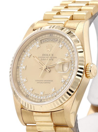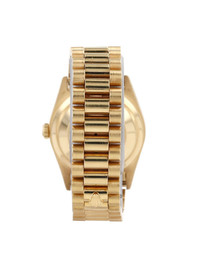 1995 Day-Date 36mm Highlights - 1995 - Champagne dial - Round case - Roman numeral hour markers - Automatic movement - Screw-down crown - This item comes with a standard one-year warranty from the boutique. Made in France Composition 18kt Yellow Gold 100% SIZE & FIT Measurement Case size 1.41 in(36 mm) Maximum strap length 6.88 in(17.5 cm)