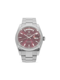 2001 Day-Date 36mm Highlights - 36mm - Pre-owned - Violet purple - 9kt white gold - Round face - Geometric dial - Baton hands - Day-date display - Signature cyclops lens - Automatic movement - Screw-down crown - Signature oyster perpetual bracelet - Folding clasp - Chronext certificate included. - An inspection by the chronext-certified watchmakers guarantees authenticity. - All repairs of the movement of the watch are covered by the chronext two-year warranty. Imported Composition 9kt White Gold 100% SIZE & FIT Measurement Case size 1.41 in(36 mm) Case thickness 0.7 in(18 mm)