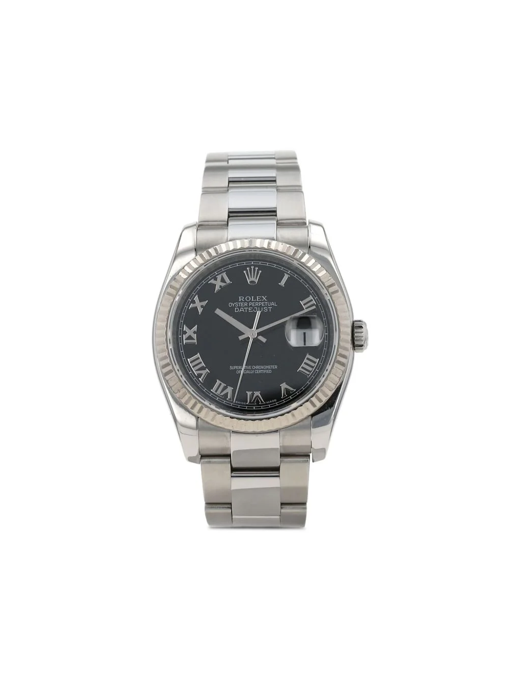 2007 Oyster Perpetual Datejust 36mm Highlights - 2007 - Pre-owned - 36mm - Black dial - White gold/stainless steel case - Round face - Fluted bezel - Roman numeral dial - Baton hands - Sweeping second hand - Stainless steel signature oyster perpetual bracelet - Automatic movement - Screw-down crown - Magnified date window - Signature cyclops lens - Water resistance up to 100m/10 atm - Folding clasp with signature crown applique - Normal everyday use and external agents may reduce the lustre of gemstones and gold surfaces. to maintain, use specific, non-abrasive products specially meant for cleaning jewellery. - Original papers included. - This item comes with a standard one-year warranty from the boutique. Made in France Composition stainless steel 100%, White Gold 100%