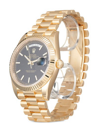 2024 unworn Day-Date 40mm Highlights - 40mm - Black - Yellow gold - Round face - Index dial - Baton hands - Calendar day-date - Fluted bezel - Screw-down crown - Yellow-gold bracelet - Folding clasp - Automatic movement - All repairs of the movement of the watch and the repairs of water-resistant watches with water damage are covered by the chronext two-year warranty. - Original box, papers and chronext certificate included. - An inspection by the chronext-certified watchmakers guarantees authenticity. Imported Composition Sapphire Glass 100%, Yellow Gold 100%