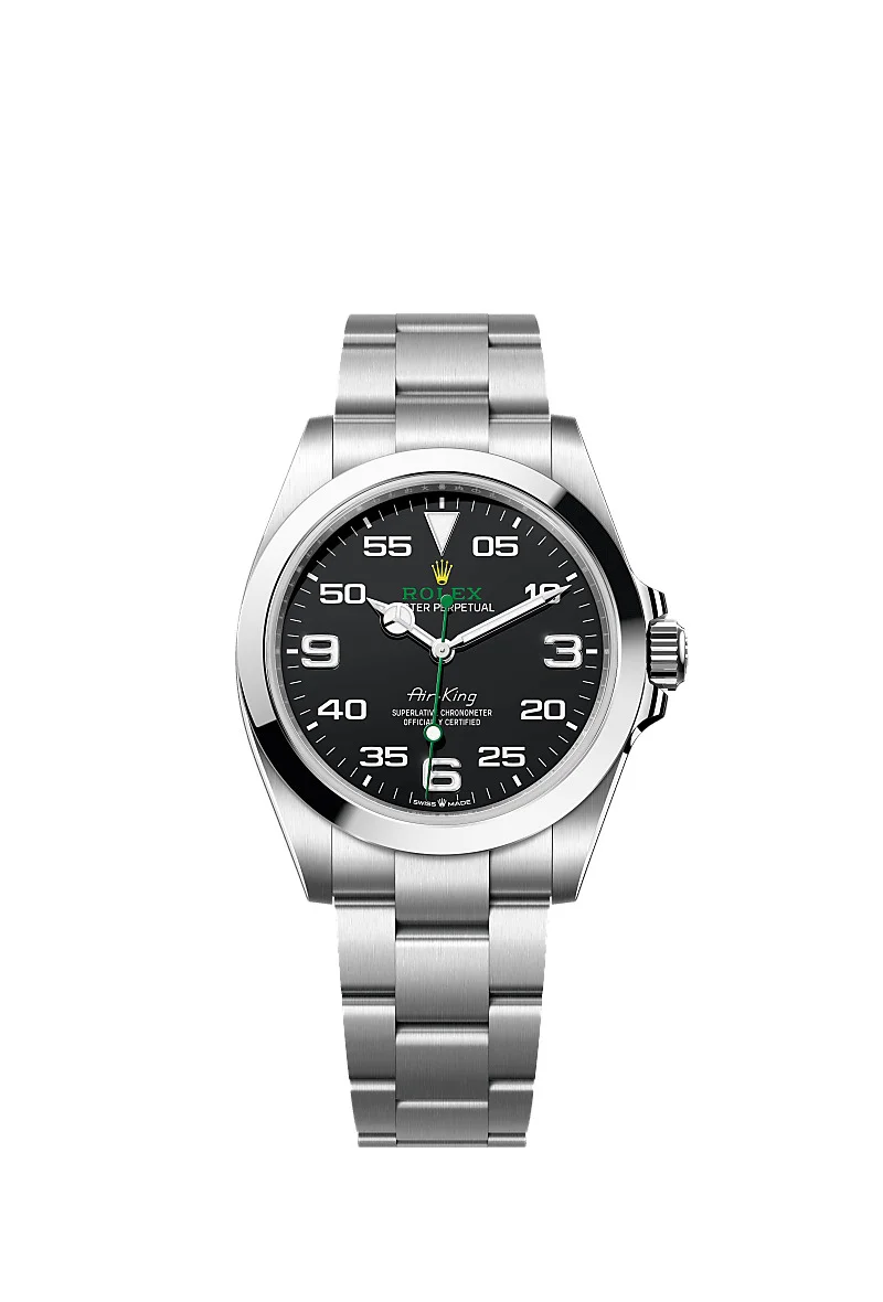 Oyster, 40 mm, Oystersteel Reference126900 Take to the skies With its40 mmcase inOystersteel, solid-link Oyster bracelet, and distinctive black dial, theAir-Kingperpetuates the aeronautical heritage of the original Rolex Oyster. Black dial Navigational time readings The Air-King dial features a distinctive black dial with a combination of large 3, 6 and 9 numerals marking the hours and a prominent minute scale for navigational time readings. It bears the name Air-King in the same lettering that was designed specially for the model in the 1950s. Oystersteel Highly resistant to corrosion Rolex uses Oystersteel for its steel watch cases. Specially developed by the brand, Oystersteel belongs to the 904L steel family, alloys most commonly used in high-technology and in the aerospace and chemical industries, where maximum resistance to corrosion is essential. Oystersteel is extremely resistant, offers an exceptional finish once polished and maintains its beauty even in the harshest environments. The Oyster bracelet Alchemy of form and function The Oyster bracelet is a perfect alchemy of form and function, aesthetics and technology, designed to be both robust and comfortable. It is equipped with an Oysterlock folding clasp, which prevents accidental opening and the Easylink comfort extension link, also exclusive to Rolex. This ingenious system allows the wearer to increase the bracelet length by approximately 5 mm, providing additional comfort in any circumstance.