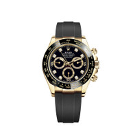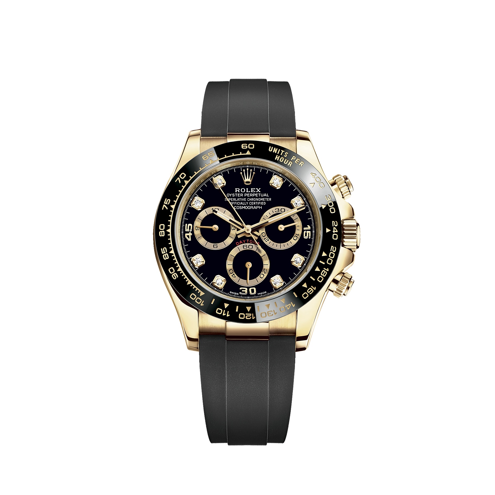 THIS OYSTER PERPETUAL COSMOGRAPH DAYTONA IN 18 CT YELLOW GOLD WITH A BLACK, DIAMOND-SET DIAL AND AN OYSTERFLEX BRACELET, FEATURES A BLACK CERACHROM BEZEL WITH TACHYMETRIC SCALE. This chronograph was designed to be the ultimate timing tool for endurance racing drivers. More than 50 years after its creation, the Cosmograph Daytona remains in a class of its own among sport chronographs and continues to transcend time. Model features Specifications Reference 116518LN
