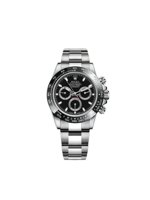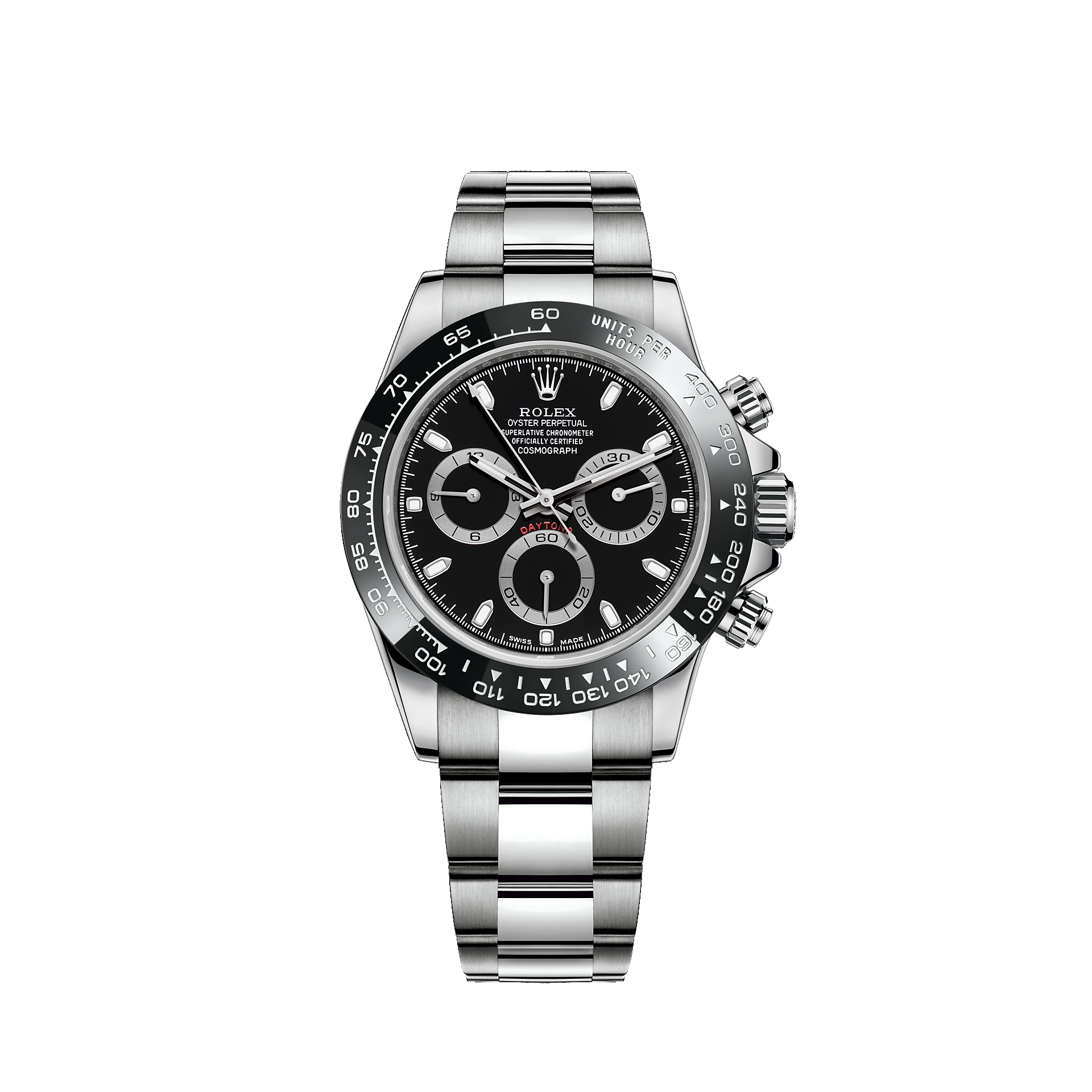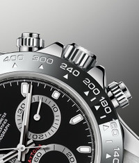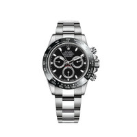 THIS OYSTER PERPETUAL COSMOGRAPH DAYTONA IN OYSTERSTEEL WITH A BLACK DIAL AND AN OYSTER BRACELET, FEATURES A BLACK CERACHROM BEZEL WITH TACHYMETRIC SCALE. This chronograph was designed to be the ultimate timing tool for endurance racing drivers. More than 50 years after its creation, the Cosmograph Daytona remains in a class of its own among sport chronographs and continues to transcend time. Model features Specifications Reference 116500LN