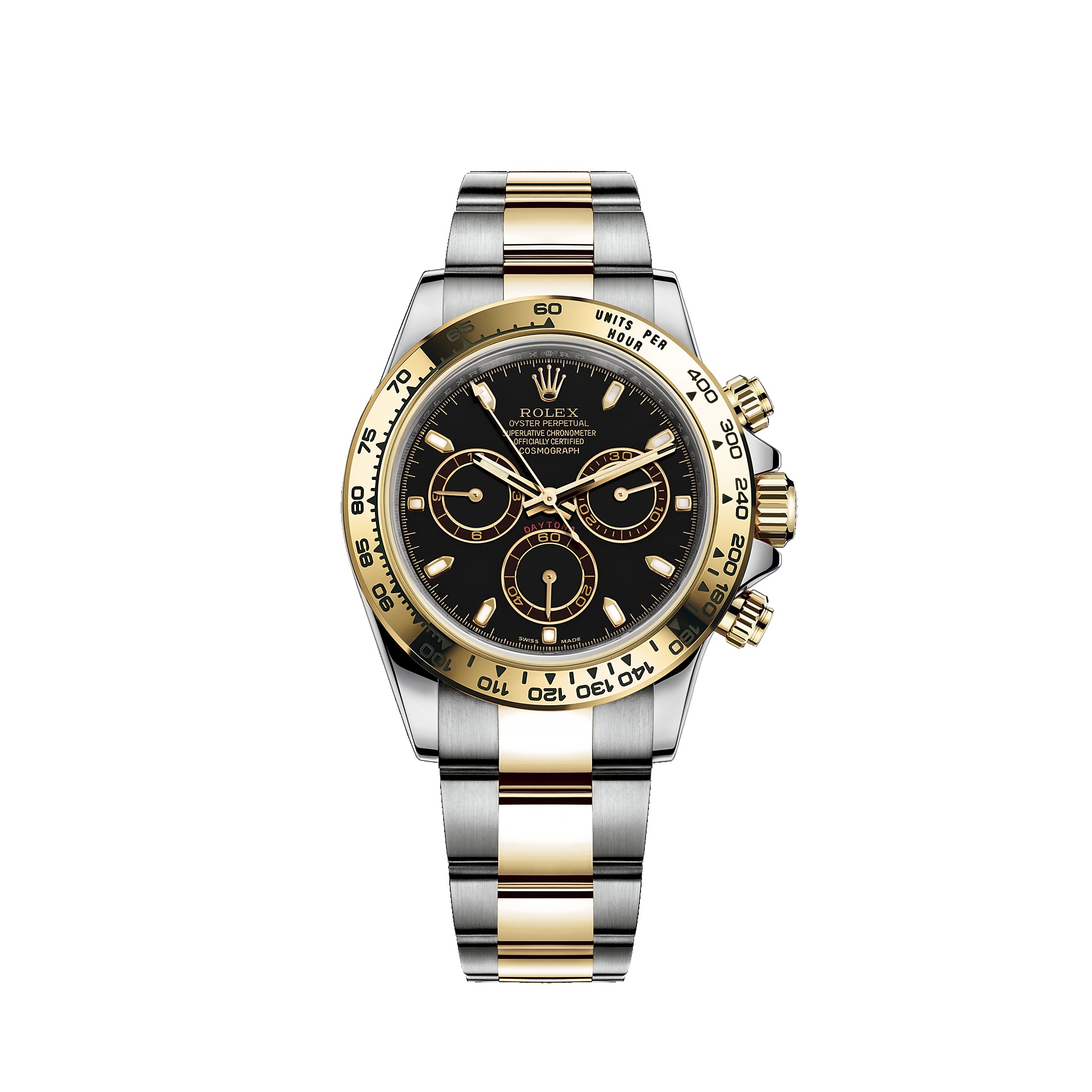 THIS OYSTER PERPETUAL COSMOGRAPH DAYTONA IN OYSTERSTEEL AND YELLOW GOLD, WITH A BLACK DIAL AND AN OYSTER BRACELET, FEATURES A YELLOW GOLD BEZEL WITH ENGRAVED TACHYMETRIC SCALE. This chronograph was designed to be the ultimate timing tool for endurance racing drivers. More than 50 years after its creation, the Cosmograph Daytona remains in a class of its own among sport chronographs and continues to transcend time. Model features Specifications Reference 116503