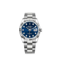 Its dial features diamonds in 18 ct gold settings. The light reflections on the case sides and lugs highlight the elegant profile of the 36 mm Oyster case, which is fitted with a fluted bezel. Aesthetically, the Datejust has spanned eras, while retaining the enduring codes that make it, notably in its traditional versions, one of the most recognized and recognizable of watches. Model features THE FLUTED BEZEL A Rolex signature WHITE ROLESOR A meeting of two metals THE OYSTER BRACELET Alchemy of form and function THE CYCLOPS LENS A magnifying lens 3235 MOVEMENT Superlative performance DATEJUST The classic watch of reference CONFIGURE Configure your Datejust ALL MODELS All Datejust models Specifications Reference 126234 Model Case Model Case Oyster, 36 mm, Oystersteel and white gold Oyster Architecture Monobloc middle case, screw-down case back and winding crown Diameter 36 mm Material White Rolesor - combination of Oystersteel and white gold Bezel Fluted Winding Crown Screw-down, Twinlock double waterproofness system Crystal Scratch-resistant sapphire, Cyclops lens over the date Water Resistance Waterproof to 100 metres / 330 feet Movement Movement Perpetual, mechanical, self-winding Calibre 3235, Manufacture Rolex Precision -2/+2 sec/day, after casing Functions Centre hour, minute and seconds hands. Instantaneous date with rapid setting. Stop-seconds for precise time setting Oscillator Paramagnetic blue Parachrom hairspring. High-performance Paraflex shock absorbers Winding Bidirectional self-winding via Perpetual rotor Power reserve Approximately 70 hours Bracelet Bracelet Oyster, flat three-piece links Bracelet Material Oystersteel Clasp Folding Oysterclasp with Easylink 5 mm comfort extension link Dial Dial Bright blue, fluted motif set with diamonds Gem setting Diamonds in 18 ct gold settings Certification Certification Superlative Chronometer (COSC + Rolex certification after casing)
