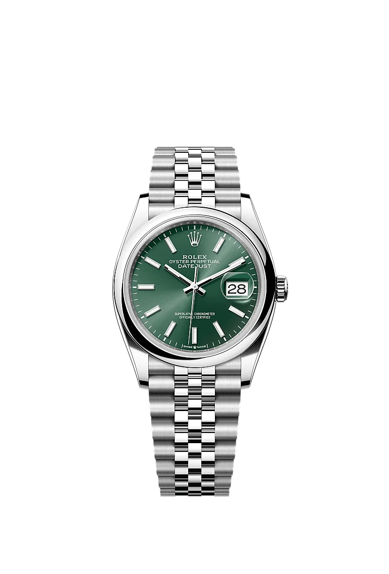 The light reflections on the case sides and lugs highlight the elegant profile of the 36 mm Oyster case, which is fitted with a domed bezel. Aesthetically, the Datejust has spanned eras, while retaining the enduring codes that make it, notably in its traditional versions, one of the most recognized and recognizable of watches. Model features OYSTERSTEEL Highly resistant to corrosion THE JUBILEE BRACELET Supple and comfortable THE CYCLOPS LENS A magnifying lens 3235 MOVEMENT Superlative performance DATEJUST The classic watch of reference CONFIGURE Configure your Datejust ALL MODELS All Datejust models Specifications Reference 126200 Model Case Model Case Oyster, 36 mm, Oystersteel Oyster Architecture Monobloc middle case, screw-down case back and winding crown Diameter 36 mm Material Oystersteel Bezel Domed Winding Crown Screw-down, Twinlock double waterproofness system Crystal Scratch-resistant sapphire, Cyclops lens over the date Water Resistance Waterproof to 100 metres / 330 feet Movement Movement Perpetual, mechanical, self-winding Calibre 3235, Manufacture Rolex Precision -2/+2 sec/day, after casing Functions Centre hour, minute and seconds hands. Instantaneous date with rapid setting. Stop-seconds for precise time setting Oscillator Paramagnetic blue Parachrom hairspring. High-performance Paraflex shock absorbers Winding Bidirectional self-winding via Perpetual rotor Power reserve Approximately 70 hours Bracelet Bracelet Jubilee, five-piece links Bracelet Material Oystersteel Clasp Folding Oysterclasp with Easylink 5 mm comfort extension link Dial Dial Mint green Details Highly legible Chromalight display with long-lasting blue luminescence Certification Certification Superlative Chronometer (COSC + Rolex certification after casing)