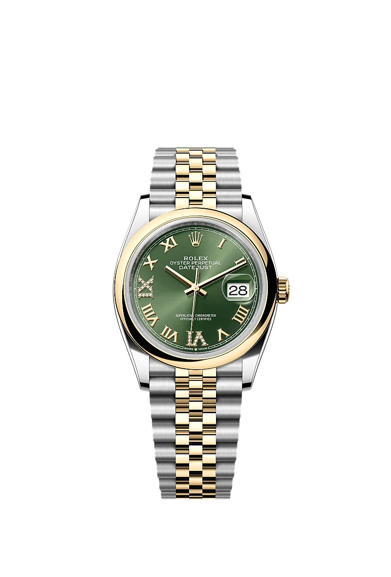 THIS OYSTER PERPETUAL DATEJUST 36 IN OYSTERSTEEL AND YELLOW GOLD FEATURES AN OLIVE-GREEN, DIAMOND-SET DIAL AND A JUBILEE BRACELET. Its dial features a Roman VI and IX in 18 ct gold, set with 24 diamonds. The light reflections on the case sides and lugs highlight the elegant profile of the 36 mm Oyster case, which is fitted with a domed bezel. Aesthetically, the Datejust has spanned eras, while retaining the enduring codes that make it, notably in its traditional versions, one of the most recognized and recognizable of watches. Model features Specifications Reference 126203