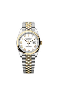 THIS OYSTER PERPETUAL DATEJUST 36 IN OYSTERSTEEL AND YELLOW GOLD FEATURES A WHITE DIAL AND A JUBILEE BRACELET. The light reflections on the case sides and lugs highlight the elegant profile of the 36 mm Oyster case, which is fitted with a domed bezel. Aesthetically, the Datejust has spanned eras, while retaining the enduring codes that make it, notably in its traditional versions, one of the most recognized and recognizable of watches. Model features Specifications Reference 126203
