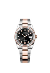 THIS OYSTER PERPETUAL DATEJUST 36 IN OYSTERSTEEL AND EVEROSE GOLD FEATURES A BRIGHT BLACK, DIAMOND-SET DIAL AND AN OYSTER BRACELET. Its dial features diamonds in 18 ct gold settings. The light reflections on the case sides and lugs highlight the elegant profile of the 36 mm Oyster case, which is fitted with a diamond-set bezel. Aesthetically, the Datejust has spanned eras, while retaining the enduring codes that make it, notably in its traditional versions, one of the most recognized and recognizable of watches. Model features Specifications Reference 126281RBR