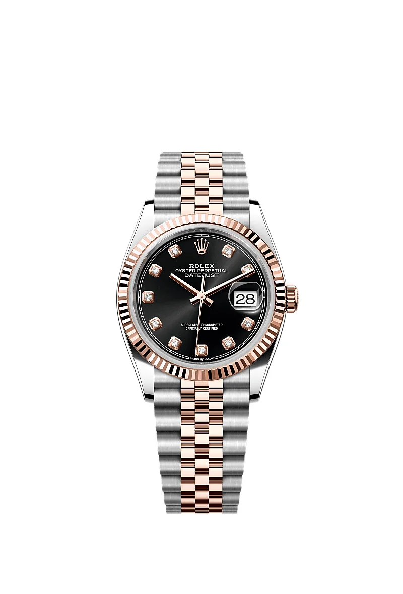 THIS OYSTER PERPETUAL DATEJUST 36 IN OYSTERSTEEL AND EVEROSE GOLD FEATURES A BRIGHT BLACK, DIAMOND-SET DIAL AND A JUBILEE BRACELET. Its dial features diamonds in 18 ct gold settings. The light reflections on the case sides and lugs highlight the elegant profile of the 36 mm Oyster case, which is fitted with a fluted bezel. Aesthetically, the Datejust has spanned eras, while retaining the enduring codes that make it, notably in its traditional versions, one of the most recognized and recognizable of watches. Model features Specifications Reference 126231
