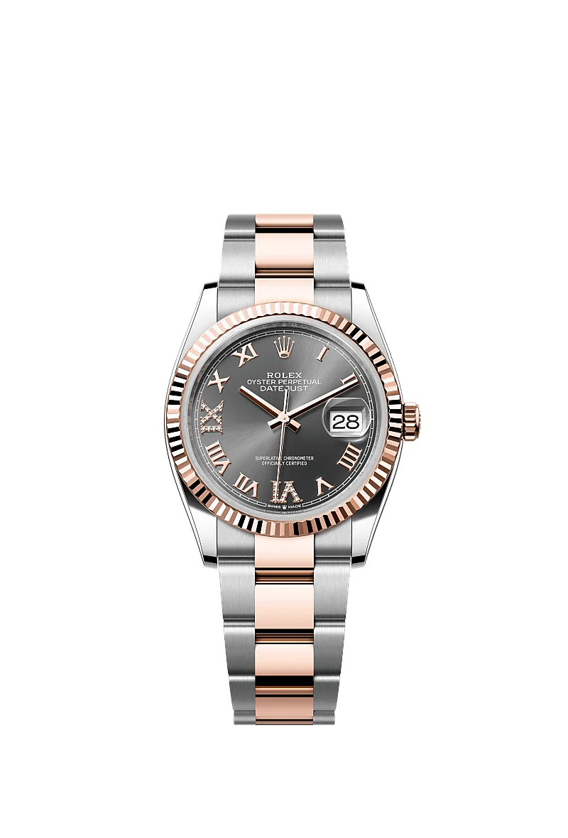 THIS OYSTER PERPETUAL DATEJUST 36 IN OYSTERSTEEL AND EVEROSE GOLD FEATURES A SLATE, DIAMOND-SET DIAL AND AN OYSTER BRACELET. Its dial features a Roman VI and IX in 18 ct gold, set with 24 diamonds. The light reflections on the case sides and lugs highlight the elegant profile of the 36 mm Oyster case, which is fitted with a fluted bezel. Aesthetically, the Datejust has spanned eras, while retaining the enduring codes that make it, notably in its traditional versions, one of the most recognized and recognizable of watches. Model features Specifications Reference 126231