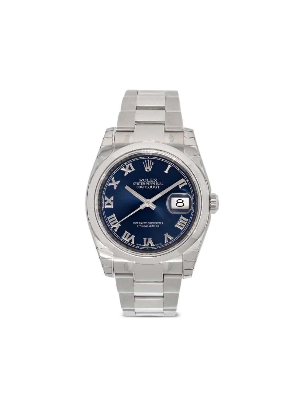 Datejust 36mm watch Highlights - Blue - Stainless steel - Round face - Roman numeral dial - Baton hands - Magnified date window - Signature cyclops lens - Automatic movement - Signature oyster perpetual bracelet - Condition: excellent. this previously owned item is in near-perfect condition with no signs of damage or use. - The original box and papers are not included. Imported Composition stainless steel 100% SIZE & FIT Measurement Case size 1.41 in(36 mm) Case thickness 0.47 in(12 mm) Washing instructions Do Not Wash/Do Not Dry Clean