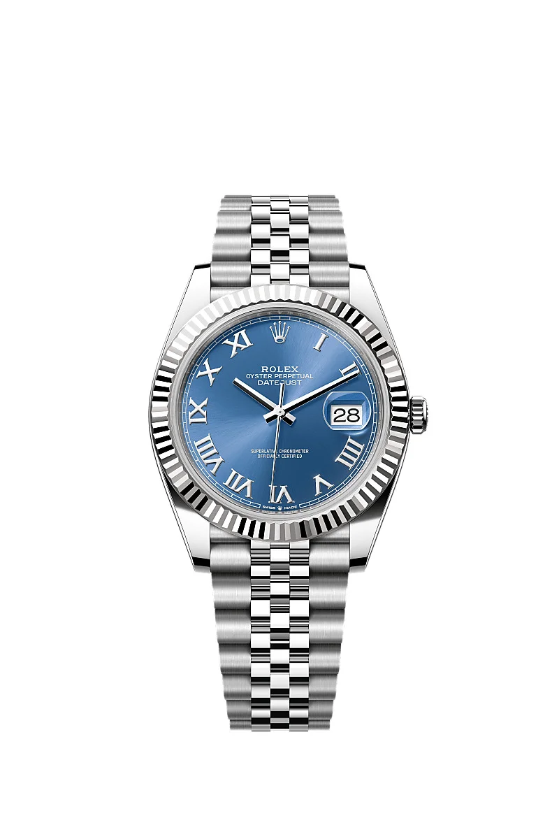 Oyster, 41 mm, Oystersteel and white gold Reference126334 Make a date of a day This Oyster PerpetualDatejust 41inOystersteel and white goldfeaturesan azzurro-bluedial anda Jubileebracelet. Fluted bezel A Rolex signature The Rolex fluted bezel is a mark of distinction. Originally, the fluting of the Oyster bezel had a functional purpose: it served to screw the bezel onto the case helping to ensure the waterproofness of the watch. It was therefore identical to the fluting on the case back, which was also screwed onto the case for waterproofness, using specific Rolex tools. Over time, the fluting became an aesthetic element, a genuine Rolex signature feature. Today the fluted bezel is a mark of distinction, in gold on this Datejust 41. Azzurro-blue dial A watchmaking technique The sunray finish creates delicate light reflections on many dials in the Oyster Perpetual collection. It is obtained using masterful brushing techniques that create grooves running outwards from the centre of the dial. Light is diffused consistently along each engraving, creating a characteristic subtle glow that moves depending on the position of the wrist. Once the sunray finish has been completed, the dial colour is applied using Physical Vapour Deposition or electroplating. A light coat of varnish gives the dial its final look. White Rolesor A meeting of two metals Gold is coveted for its lustre and nobility. Steel reinforces strength and reliability. Together, they harmoniously combine the best of their properties. A true Rolex signature, Rolesor has featured on Rolex models since the early 1930s, and was trademarked as a name in 1933. It is one of the prominent pillars of the Oyster collection. The Jubilee bracelet Supple and comfortable The design, development and production of Rolex bracelets and clasps, as well as the stringent tests they face, involve advanced high technology. And, as with all the components of the watch, aesthetic controls by the human eye guarantee impeccable beauty. The Jubilee, a supple and comfortable five-piece link metal bracelet, was designed and made especially for the launch of the Oyster Perpetual Datejust in 1945.