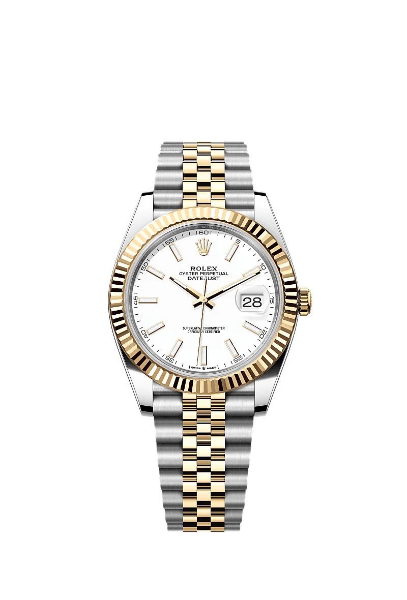 Oyster, 41 mm, Oystersteel and yellow gold Reference126333 Make a date of a day This Oyster PerpetualDatejust 41inOystersteel and yellow goldfeaturesa whitedial anda Jubileebracelet. Fluted bezel A Rolex signature The Rolex fluted bezel is a mark of distinction. Originally, the fluting of the Oyster bezel had a functional purpose: it served to screw the bezel onto the case helping to ensure the waterproofness of the watch. It was therefore identical to the fluting on the case back, which was also screwed onto the case for waterproofness, using specific Rolex tools. Over time, the fluting became an aesthetic element, a genuine Rolex signature feature. Today the fluted bezel is a mark of distinction, in gold on this Datejust 41. White dial Limitless freedom Lacquer combines almost limitless freedom of colour with intensity and a smooth finish. The lacquering technique consists of successively depositing six thin layers of lacquer on a brass base plate. A colourless varnish is then applied to give the colour or shade all of its depth and shine. Once the varnish is dry, the surface of the dial is polished to magnify the colour; the dial is then ready to be pad printed and receive its appliques. Yellow Rolesor A meeting of two metals Gold is coveted for its lustre and nobility. Steel reinforces strength and reliability. Together, they harmoniously combine the best of their properties. A true Rolex signature, Rolesor has featured on Rolex models since the early 1930s, and was trademarked as a name in 1933. It is one of the prominent pillars of the Oyster collection. The Jubilee bracelet Supple and comfortable The design, development and production of Rolex bracelets and clasps, as well as the stringent tests they face, involve advanced high technology. And, as with all the components of the watch, aesthetic controls by the human eye guarantee impeccable beauty. The Jubilee, a supple and comfortable five-piece link metal bracelet, was designed and made especially for the launch of the Oyster Perpetual Datejust in 1945.