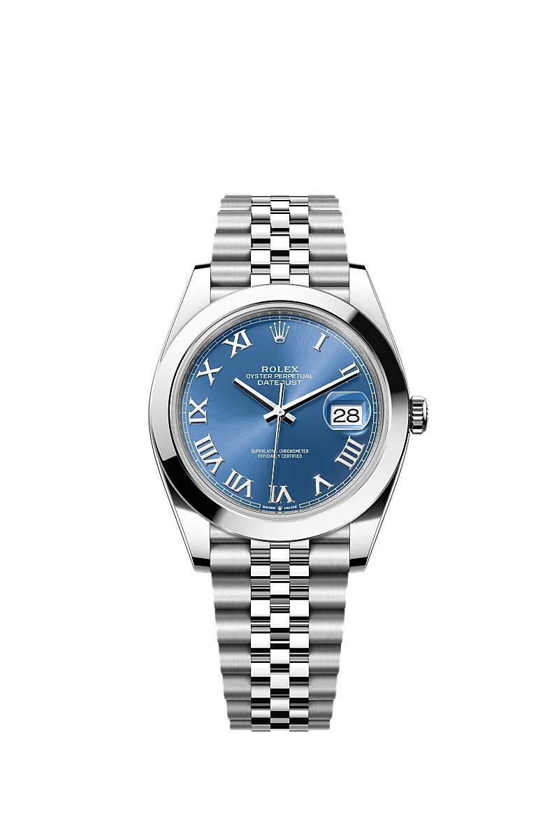 Oyster, 41 mm, Oystersteel Reference126300 Make a date of a day This Oyster PerpetualDatejust 41inOystersteelfeaturesan azzurro-bluedial anda Jubileebracelet. Azzurro-blue dial A watchmaking technique The sunray finish creates delicate light reflections on many dials in the Oyster Perpetual collection. It is obtained using masterful brushing techniques that create grooves running outwards from the centre of the dial. Light is diffused consistently along each engraving, creating a characteristic subtle glow that moves depending on the position of the wrist. Once the sunray finish has been completed, the dial colour is applied using Physical Vapour Deposition or electroplating. A light coat of varnish gives the dial its final look. Oystersteel Highly resistant to corrosion Rolex uses Oystersteel for its steel watch cases. Specially developed by the brand, Oystersteel belongs to the 904L steel family, alloys most commonly used in high-technology and in the aerospace and chemical industries, where maximum resistance to corrosion is essential. Oystersteel is extremely resistant, offers an exceptional finish once polished and maintains its beauty even in the harshest environments. The Jubilee bracelet Supple and comfortable The design, development and production of Rolex bracelets and clasps, as well as the stringent tests they face, involve advanced high technology. And, as with all the components of the watch, aesthetic controls by the human eye guarantee impeccable beauty. The Jubilee, a supple and comfortable five-piece link metal bracelet, was designed and made especially for the launch of the Oyster Perpetual Datejust in 1945.
