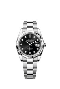 Oyster, 41 mm, Oystersteel and white gold Reference126334 Make a date of a day This Oyster PerpetualDatejust 41inOystersteel and white goldfeaturesa bright black, diamond-setdial andan Oysterbracelet. Bright black dial A watchmaking technique The sunray finish creates delicate light reflections on many dials in the Oyster Perpetual collection. It is obtained using masterful brushing techniques that create grooves running outwards from the centre of the dial. Light is diffused consistently along each engraving, creating a characteristic subtle glow that moves depending on the position of the wrist. Once the sunray finish has been completed, the dial colour is applied using Physical Vapour Deposition or electroplating. A light coat of varnish gives the dial its final look. Fluted bezel A Rolex signature The Rolex fluted bezel is a mark of distinction. Originally, the fluting of the Oyster bezel had a functional purpose: it served to screw the bezel onto the case helping to ensure the waterproofness of the watch. It was therefore identical to the fluting on the case back, which was also screwed onto the case for waterproofness, using specific Rolex tools. Over time, the fluting became an aesthetic element, a genuine Rolex signature feature. Today the fluted bezel is a mark of distinction, in gold on this Datejust 41. White Rolesor A meeting of two metals Gold is coveted for its lustre and nobility. Steel reinforces strength and reliability. Together, they harmoniously combine the best of their properties. A true Rolex signature, Rolesor has featured on Rolex models since the early 1930s, and was trademarked as a name in 1933. It is one of the prominent pillars of the Oyster collection. The Oyster bracelet Alchemy of form and function The Oyster bracelet is a perfect alchemy of form and function, aesthetics and technology, designed to be both robust and comfortable. It is equipped with an Oysterclasp and the Easylink comfort extension link, also exclusive to Rolex. This ingenious system allows the wearer to increase the bracelet length by approximately 5 mm, providing additional comfort in any circumstance.