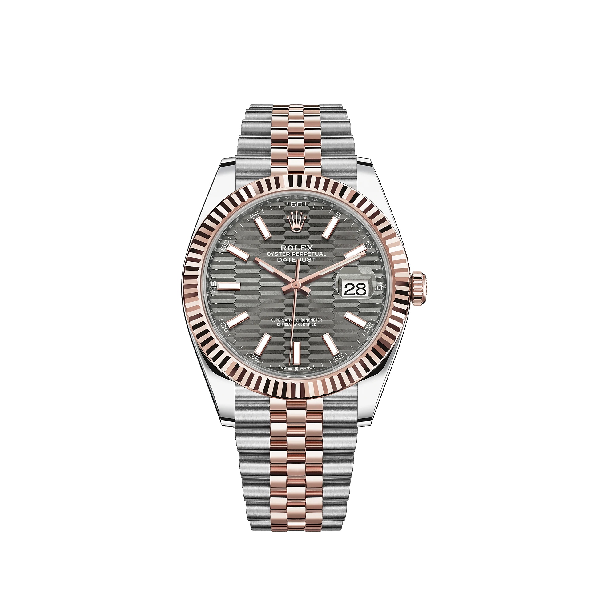 THIS OYSTER PERPETUAL DATEJUST 41 IN OYSTERSTEEL AND EVEROSE GOLD FEATURES A SLATE, FLUTED-MOTIF DIAL AND A JUBILEE BRACELET. The light reflections on the case sides and lugs highlight the elegant profile of the 41 mm Oyster case, which is fitted with a fluted bezel. Aesthetically, the Datejust has spanned eras, while retaining the enduring codes that make it, notably in its traditional versions, one of the most recognized and recognizable of watches. Model features Specifications Reference 126331