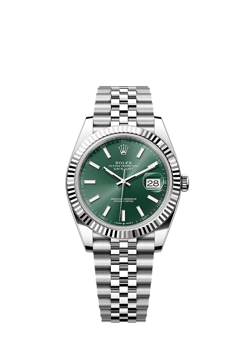 Oyster, 41 mm, Oystersteel and white gold Reference126334 Make a date of a day This Oyster PerpetualDatejust 41inOystersteel and white goldfeaturesa mint greendial anda Jubileebracelet. Fluted bezel A Rolex signature The Rolex fluted bezel is a mark of distinction. Originally, the fluting of the Oyster bezel had a functional purpose: it served to screw the bezel onto the case helping to ensure the waterproofness of the watch. It was therefore identical to the fluting on the case back, which was also screwed onto the case for waterproofness, using specific Rolex tools. Over time, the fluting became an aesthetic element, a genuine Rolex signature feature. Today the fluted bezel is a mark of distinction, in gold on this Datejust 41. Mint green dial A watchmaking technique The sunray finish creates delicate light reflections on many dials in the Oyster Perpetual collection. It is obtained using masterful brushing techniques that create grooves running outwards from the centre of the dial. Light is diffused consistently along each engraving, creating a characteristic subtle glow that moves depending on the position of the wrist. Once the sunray finish has been completed, the dial colour is applied using Physical Vapour Deposition or electroplating. A light coat of varnish gives the dial its final look. White Rolesor A meeting of two metals Gold is coveted for its lustre and nobility. Steel reinforces strength and reliability. Together, they harmoniously combine the best of their properties. A true Rolex signature, Rolesor has featured on Rolex models since the early 1930s, and was trademarked as a name in 1933. It is one of the prominent pillars of the Oyster collection. The Jubilee bracelet Supple and comfortable The design, development and production of Rolex bracelets and clasps, as well as the stringent tests they face, involve advanced high technology. And, as with all the components of the watch, aesthetic controls by the human eye guarantee impeccable beauty. The Jubilee, a supple and comfortable five-piece link metal bracelet, was designed and made especially for the launch of the Oyster Perpetual Datejust in 1945.