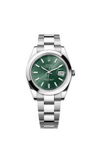 Oyster, 41 mm, Oystersteel Reference126300 Make a date of a day This Oyster PerpetualDatejust 41inOystersteelfeaturesa mint greendial andan Oysterbracelet. Mint green dial A watchmaking technique The sunray finish creates delicate light reflections on many dials in the Oyster Perpetual collection. It is obtained using masterful brushing techniques that create grooves running outwards from the centre of the dial. Light is diffused consistently along each engraving, creating a characteristic subtle glow that moves depending on the position of the wrist. Once the sunray finish has been completed, the dial colour is applied using Physical Vapour Deposition or electroplating. A light coat of varnish gives the dial its final look. Oystersteel Highly resistant to corrosion Rolex uses Oystersteel for its steel watch cases. Specially developed by the brand, Oystersteel belongs to the 904L steel family, alloys most commonly used in high-technology and in the aerospace and chemical industries, where maximum resistance to corrosion is essential. Oystersteel is extremely resistant, offers an exceptional finish once polished and maintains its beauty even in the harshest environments. The Oyster bracelet Alchemy of form and function The Oyster bracelet is a perfect alchemy of form and function, aesthetics and technology, designed to be both robust and comfortable. It is equipped with an Oysterclasp and the Easylink comfort extension link, also exclusive to Rolex. This ingenious system allows the wearer to increase the bracelet length by approximately 5 mm, providing additional comfort in any circumstance.