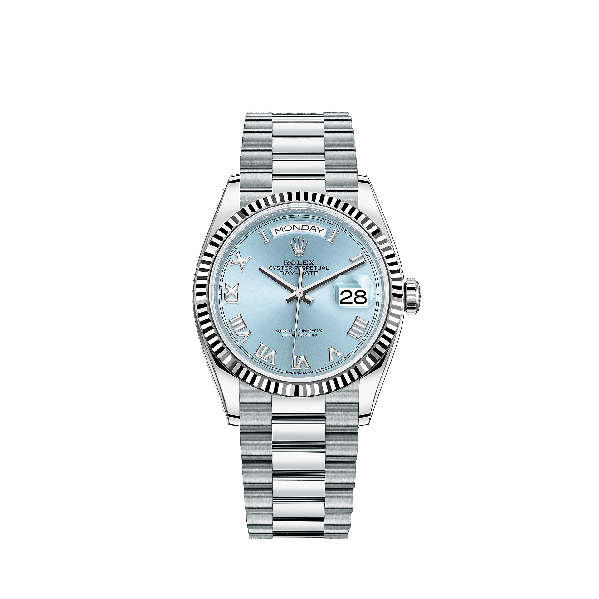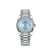 The Day-Date was the first watch to indicate the day of the week spelt out in full when it was first presented in 1956. Model features THE FLUTED BEZEL A Rolex signature PLATINUM The noblest of metals THE PRESIDENT BRACELET The ultimate refinement DAY DISPLAY Instantaneous at midnight THE CYCLOPS LENS A magnifying lens 3255 MOVEMENT Superlative performance DAY-DATE The ultimate watch of prestige CONFIGURE Configure your Day-Date ALL MODELS All Day-Date models Specifications Reference 128236 Model Case Model Case Oyster, 36 mm, platinum Oyster Architecture Monobloc middle case, screw-down case back and winding crown Diameter 36 mm Material Platinum Bezel Fluted Winding Crown Screw-down, Twinlock double waterproofness system Crystal Scratch-resistant sapphire, Cyclops lens over the date Water Resistance Waterproof to 100 metres / 330 feet Movement Movement Perpetual, mechanical, self-winding Calibre 3255, Manufacture Rolex Precision -2/+2 sec/day, after casing Functions Centre hour, minute and seconds hands. Instantaneous day and date in apertures, unrestricted rapid-setting. Stop-seconds for precise time setting Oscillator Paramagnetic blue Parachrom hairspring. High-performance Paraflex shock absorbers Winding Bidirectional self-winding via Perpetual rotor Power reserve Approximately 70 hours Bracelet Bracelet President, semi-circular three-piece links Bracelet Material Platinum Clasp Concealed folding Crownclasp Dial Dial Ice blue Certification Certification Superlative Chronometer (COSC + Rolex certification after casing)