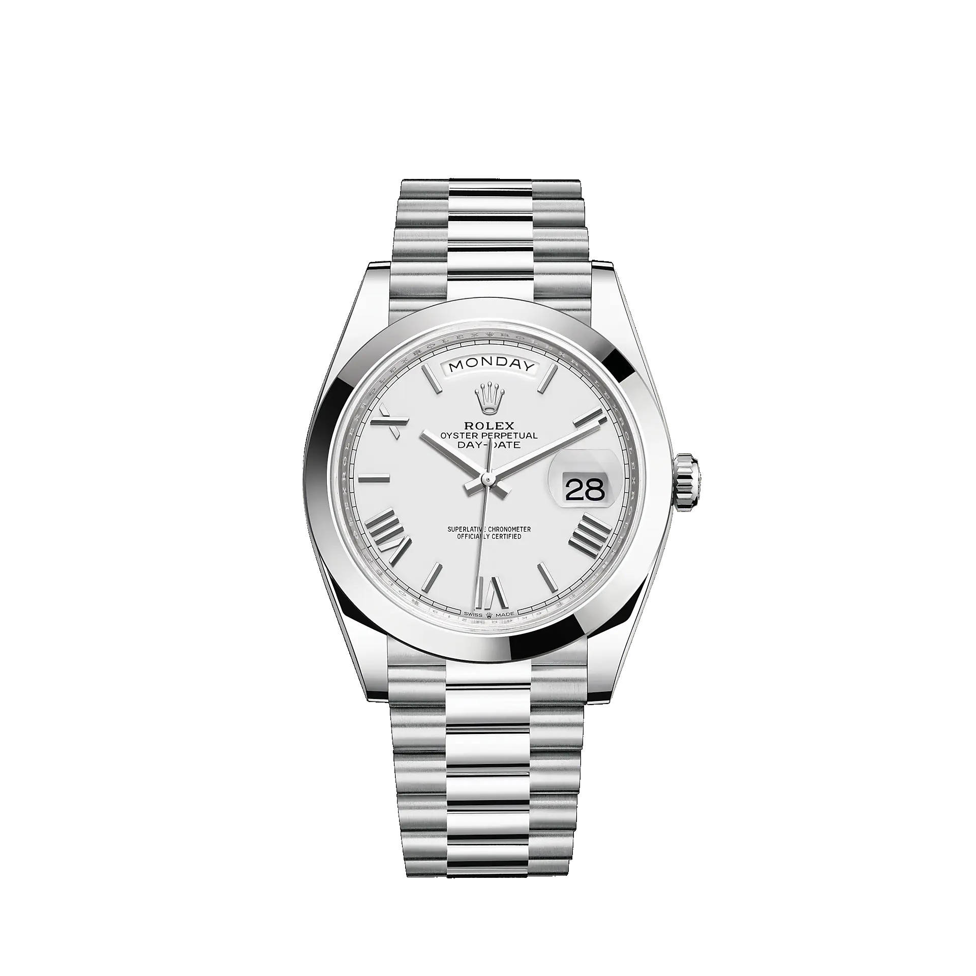 THE OYSTER PERPETUAL DAY-DATE 40 IN PLATINUM WITH A WHITE DIAL, SMOOTH BEZEL AND A PRESIDENT BRACELET. The Day-Date was the first watch to indicate the day of the week spelt out in full when it was first presented in 1956. Model features Specifications Reference 228206