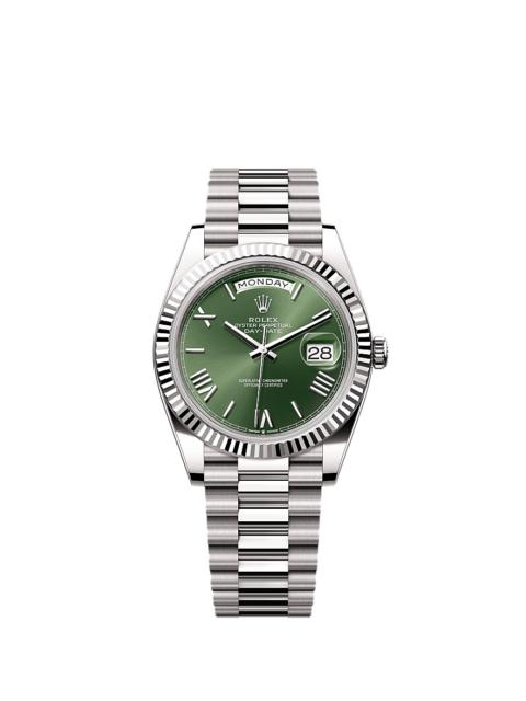 Fluted bezel A Rolex signature The Rolex fluted bezel is a mark of distinction. Originally, the fluting of the Oyster bezel had a functional purpose: it served to screw the bezel onto the case helping to ensure the waterproofness of the watch. It was therefore identical to the fluting on the case back, which was also screwed onto the case for waterproofness, using specific Rolex tools. Over time, the fluting became an aesthetic element, a genuine Rolex signature feature. Today the fluted bezel is a mark of distinction, in gold on this Day-Date 40. Blue ombre dial Continuity of a design The ombre dial features a coloured surface at the centre, progresses to a deep black around the edge. This dial represents the continuity of a design that Rolex introduced in the 1980s and relaunched in 2019. The manufacture of these dials with a concentric gradient involves the application of black lacquer, a delicate operation overseen by a specialist whose task it is to ensure the harmonious transition from colour to darkness. 18 ct white gold Commitment to excellence By operating its own exclusive foundry, Rolex has the unrivalled ability to cast the highest quality 18 ct gold alloys. According to the proportion of silver, copper, platinum or palladium added, different types of 18 ct gold are obtained: yellow, pink or white. They are made with only the purest metals and meticulously inspected in an in-house laboratory with state-of-the-art equipment, before the gold is formed and shaped with the same painstaking attention to quality. Rolex's commitment to excellence begins at the source. The President bracelet The ultimate refinement The design, development and production of Rolex bracelets and clasps, as well as the stringent tests they face, involve advanced high technology. And, as with all the components of the watch, aesthetic controls by the human eye guarantee impeccable beauty. The President bracelet, with its semi-circular three piece links, was created in 1956 for the launch of the Oyster Perpetual Day-Date. It represents the ultimate in refinement and comfort and is always made of carefully selected precious metals.