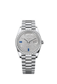 Oyster, 40 mm, platinum and diamonds Reference228396TBR Ideal accomplishments The Oyster PerpetualDay-Date 40inplatinum, witha diamond-paveddial,diamond-setbezel anda Presidentbracelet. Diamond-Paved Dial Optimal brilliance This dial features 8 baguette-cut diamonds and 2 baguette-cut sapphires at 6 and 9 o'clock. Diamonds, sapphires, rubies, emeralds – the noblest and most precious stones are selected to grace Rolex timepieces. The brand has in-house expertise and equipment enabling it to bejewel any model in its catalogue. Experienced gemmologists first select gemstones of the highest quality. For this, they can rely on their own seasoned judgement as well as state-of-the-art analysis equipment. The stones are then entrusted to the gem-setters, who skilfully place each precious stone onto the watch by hand, one by one, assuring precision to within hundredths of a millimetre. Such stringent tolerances guarantee that each stone shines with optimal brilliance and is perfectly aligned with those around it. These time-honoured gestures, which may be repeated many hundreds of times, ensure that each gem-set watch produced by Rolex sparkles with exceptional intensity and reflects the standard of excellence required by the brand. Diamond-set bezel A sparkling symphony Gem-setters, like sculptors, finely carve the precious metal to hand-shape the seat in which each gemstone will be perfectly lodged. With the art and craft of a jeweller, the stone is placed and meticulously aligned with the others, then firmly secured in its gold or platinum setting. Besides the intrinsic quality of the stones, several other criteria contribute to the beauty of Rolex gem-setting: the precise alignment of the height of the gems, their orientation and position, the regularity, strength and proportions of the setting as well as the intricate finishing of the metalwork. A sparkling symphony to enhance the watch and enchant the wearer. Platinum The noblest of metals Rare and precious, platinum is striking for its silvery whiteness and vibrant luminosity. It is among the densest and heaviest metals in the world, distinguished by unique chemical and physical properties such as exceptional corrosion resistance. Paradoxically, it is also soft, elastic and highly malleable, which makes machining and polishing especially difficult, demanding an extremely high degree of skill. Rolex always uses 950 platinum, an alloy consisting of 950‰ (thousandths) platinum, painstakingly crafted in-house by the fine metalworkers at Rolex. The noblest of metals for the finest of watches. The President bracelet The ultimate refinement The design, development and production of Rolex bracelets and clasps, as well as the stringent tests they face, involve advanced high technology. And, as with all the components of the watch, aesthetic controls by the human eye guarantee impeccable beauty. The President bracelet, with its semi-circular three piece links, was created in 1956 for the launch of the Oyster Perpetual Day-Date. It represents the ultimate in refinement and comfort and is always made of carefully selected precious metals.