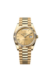 Oyster, 40 mm, yellow gold Reference228238 Ideal accomplishments The Oyster PerpetualDay-Date 40in18 ct yellow goldwitha champagne-colourdial,flutedbezel anda Presidentbracelet. Fluted bezel A Rolex signature The Rolex fluted bezel is a mark of distinction. Originally, the fluting of the Oyster bezel had a functional purpose: it served to screw the bezel onto the case helping to ensure the waterproofness of the watch. It was therefore identical to the fluting on the case back, which was also screwed onto the case for waterproofness, using specific Rolex tools. Over time, the fluting became an aesthetic element, a genuine Rolex signature feature. Today the fluted bezel is a mark of distinction, in gold on this Day-Date 40. Champagne-colour dial A watchmaking technique The sunray finish creates delicate light reflections on many dials in the Oyster Perpetual collection. It is obtained using masterful brushing techniques that create grooves running outwards from the centre of the dial. Light is diffused consistently along each engraving, creating a characteristic subtle glow that moves depending on the position of the wrist. Once the sunray finish has been completed, the dial colour is applied using Physical Vapour Deposition or electroplating. A light coat of varnish gives the dial its final look. 18 ct yellow gold Commitment to excellence By operating its own exclusive foundry, Rolex has the unrivalled ability to cast the highest quality 18 ct gold alloys. According to the proportion of silver, copper, platinum or palladium added, different types of 18 ct gold are obtained: yellow, pink or white. They are made with only the purest metals and meticulously inspected in an in-house laboratory with state-of-the-art equipment, before the gold is formed and shaped with the same painstaking attention to quality. Rolex's commitment to excellence begins at the source. The President bracelet The ultimate refinement The design, development and production of Rolex bracelets and clasps, as well as the stringent tests they face, involve advanced high technology. And, as with all the components of the watch, aesthetic controls by the human eye guarantee impeccable beauty. The President bracelet, with its semi-circular three piece links, was created in 1956 for the launch of the Oyster Perpetual Day-Date. It represents the ultimate in refinement and comfort and is always made of carefully selected precious metals.