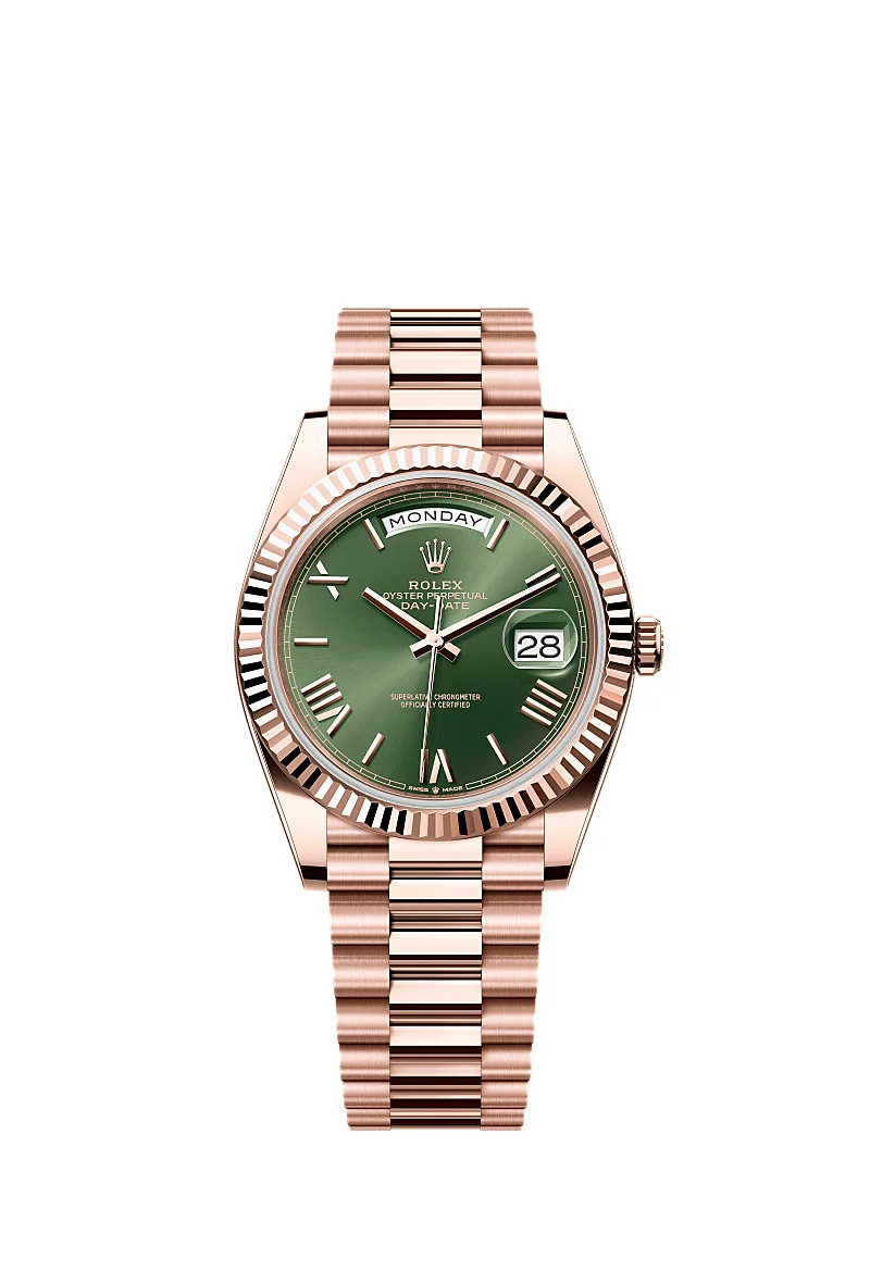 Oyster, 40 mm, Everose gold Reference228235 Ideal accomplishments The Oyster PerpetualDay-Date 40in18 ct Everose goldwithan olive-greendial,flutedbezel anda Presidentbracelet. Fluted bezel A Rolex signature The Rolex fluted bezel is a mark of distinction. Originally, the fluting of the Oyster bezel had a functional purpose: it served to screw the bezel onto the case helping to ensure the waterproofness of the watch. It was therefore identical to the fluting on the case back, which was also screwed onto the case for waterproofness, using specific Rolex tools. Over time, the fluting became an aesthetic element, a genuine Rolex signature feature. Today the fluted bezel is a mark of distinction, in gold on this Day-Date 40. Olive-Green Dial A watchmaking technique The sunray finish creates delicate light reflections on many dials in the Oyster Perpetual collection. It is obtained using masterful brushing techniques that create grooves running outwards from the centre of the dial. Light is diffused consistently along each engraving, creating a characteristic subtle glow that moves depending on the position of the wrist. Once the sunray finish has been completed, the dial colour is applied using Physical Vapour Deposition or electroplating. A light coat of varnish gives the dial its final look. 18 ct Everose gold An exclusive patent To preserve the beauty of its pink gold watches, Rolex created and patented an exclusive 18 ct pink gold alloy cast in its own foundry: Everose gold. Introduced in 2005, 18 ct Everose is used on all Rolex Oyster models in pink gold. The President bracelet The ultimate refinement The design, development and production of Rolex bracelets and clasps, as well as the stringent tests they face, involve advanced high technology. And, as with all the components of the watch, aesthetic controls by the human eye guarantee impeccable beauty. The President bracelet, with its semi-circular three piece links, was created in 1956 for the launch of the Oyster Perpetual Day-Date. It represents the ultimate in refinement and comfort and is always made of carefully selected precious metals.