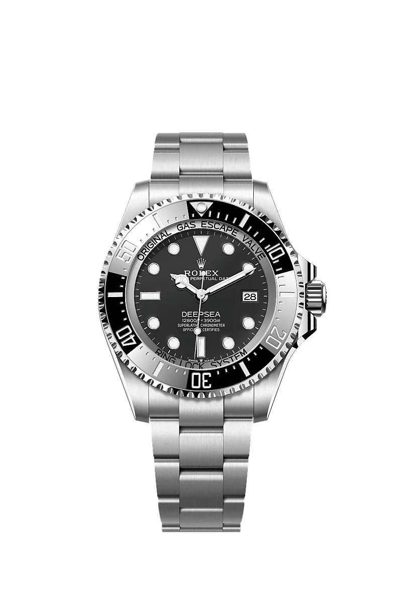 Ceramic Bezel and Luminescent Display Legendary divers’ watch The 60-minute graduated, unidirectional rotatable bezel of the Rolex Deepsea enables divers to precisely and safely monitor their dive and decompression times. It is equipped with a patented black Cerachrom bezel insert manufactured by Rolex in a virtually scratchproof ceramic whose colour is unaffected by ultraviolet rays. The graduation is coated via PVD (Physical Vapour Deposition) with a thin layer of platinum. The dial features large Chromalight hour markers and hands, filled with luminescent material that emits a long-lasting blue glow for excellent legibility in dark conditions. Intense black dial For legibility underwater The dial’s luminescent Chromalight display is an innovation that improved visibility in dark environments, an essential feature for divers. Hour markers in simple shapes – triangles, circles, rectangles – and broad hour and minute hands enable instant and reliable reading to prevent any risk of confusion underwater. Oystersteel Highly resistant to corrosion Rolex uses Oystersteel for its steel watch cases. Specially developed by the brand, Oystersteel belongs to the 904L steel family, alloys most commonly used in high-technology and in the aerospace and chemical industries, where maximum resistance to corrosion is essential. Oystersteel is extremely resistant, offers an exceptional finish once polished and maintains its beauty even in the harshest environments. The Oyster bracelet Alchemy of form and function The Oyster bracelet is a perfect alchemy of form and function, aesthetics and technology, designed to be both robust and comfortable. It is equipped with an Oysterlock clasp, which prevents accidental opening, and an ingenious Glidelock, allowing fine adjustments of the bracelet without using any tools — and allowing it to be worn comfortably over a diving suit.