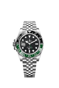 Oyster, 40 mm, Oystersteel Reference126720VTNR In connection with the world The Oyster PerpetualGMT-Master IIinOystersteelwitha blackdial anda Jubileebracelet. 24-Hour Rotatable Bezel Innovative high-technology This model features a black dial and a two-colour Cerachrom bezel insert in green and black ceramic. In addition to conventional hour, minute and seconds hands, the GMT-Master II features an arrow-tipped hand, which circles the dial once every 24 hours, as well as a bidirectional rotatable 24-hour graduated bezel. The distinctively coloured 24-hour hand displays the “home” reference time in a first time zone which can be read on the graduations on the bezel. The traveller’s local time is easily set by “jumping” from hour to hour, thanks to an ingenious mechanism operated via the winding crown: the hour hand can be adjusted forwards or backwards independently of the minute and seconds hands. This allows travellers to adapt to their new time zone without affecting the precision of their timekeeping. The Cerachrom bezel insert features an original colour combination: black and an exclusive green that is reserved for this model. Black dial High legibility in all circumstances Like all Rolex Professional watches, the GMT-Master II offers exceptional legibility in all circumstances, and especially in the dark, thanks to its Chromalight display. The broad hands and hour markers in simple shapes – triangles, circles, rectangles – are filled with a luminescent material emitting a long-lasting glow. On this novel version of the watch, the crown and crown guard are on the left side of the watch case. The date aperture and the Cyclops lens are at 9 o’clock. Oystersteel Highly resistant to corrosion Rolex uses Oystersteel for its steel watch cases. Specially developed by the brand, Oystersteel belongs to the 904L steel family, alloys most commonly used in high-technology and in the aerospace and chemical industries, where maximum resistance to corrosion is essential. Oystersteel is extremely resistant, offers an exceptional finish once polished and maintains its beauty even in the harshest environments. The Jubilee bracelet Supple and comfortable This version of the GMT-Master II is fitted with a Jubilee bracelet. Supple and comfortable, the five-piece link Jubilee bracelet was specially created for the launch of the Oyster Perpetual Datejust model in 1945. The Jubilee bracelet on this model is equipped with a Rolex-designed, patented Oysterlock folding safety clasp, which prevents accidental opening. It also features the Easylink comfort extension link, developed by the brand, which allows the bracelet length to be increased by approximately 5 mm. A concealed attachment system ensures seamless visual continuity between the bracelet and case.