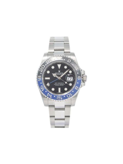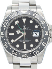 GMT Master II 40mm Highlights - Stainless steel case - Automatic movement - Black - Geometric dial - Arrow hands - Count-up bezel - Screw-down crown - Stainless steel link bracelet - Date indication - Condition: excellent. this previously owned item is in near-perfect condition with no signs of damage or use. Imported Composition stainless steel 100% SIZE & FIT Measurement Case size 1.57 in(40 mm) Case thickness 0.46 in(11.8 mm) Strap width 0.78 in(20 mm)