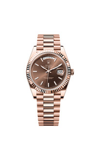 Oyster, 40 mm, Everose gold Reference228235 Ideal accomplishments The Oyster PerpetualDay-Date 40in18 ct Everose goldwitha chocolatedial,flutedbezel anda Presidentbracelet. Fluted bezel A Rolex signature The Rolex fluted bezel is a mark of distinction. Originally, the fluting of the Oyster bezel had a functional purpose: it served to screw the bezel onto the case helping to ensure the waterproofness of the watch. It was therefore identical to the fluting on the case back, which was also screwed onto the case for waterproofness, using specific Rolex tools. Over time, the fluting became an aesthetic element, a genuine Rolex signature feature. Today the fluted bezel is a mark of distinction, in gold on this Day-Date 40. Chocolate Dial A watchmaking technique The sunray finish creates delicate light reflections on many dials in the Oyster Perpetual collection. It is obtained using masterful brushing techniques that create grooves running outwards from the centre of the dial. Light is diffused consistently along each engraving, creating a characteristic subtle glow that moves depending on the position of the wrist. Once the sunray finish has been completed, the dial colour is applied using Physical Vapour Deposition or electroplating. A light coat of varnish gives the dial its final look. 18 ct Everose gold An exclusive patent To preserve the beauty of its pink gold watches, Rolex created and patented an exclusive 18 ct pink gold alloy cast in its own foundry: Everose gold. Introduced in 2005, 18 ct Everose is used on all Rolex Oyster models in pink gold. The President bracelet The ultimate refinement The design, development and production of Rolex bracelets and clasps, as well as the stringent tests they face, involve advanced high technology. And, as with all the components of the watch, aesthetic controls by the human eye guarantee impeccable beauty. The President bracelet, with its semi-circular three piece links, was created in 1956 for the launch of the Oyster Perpetual Day-Date. It represents the ultimate in refinement and comfort and is always made of carefully selected precious metals.