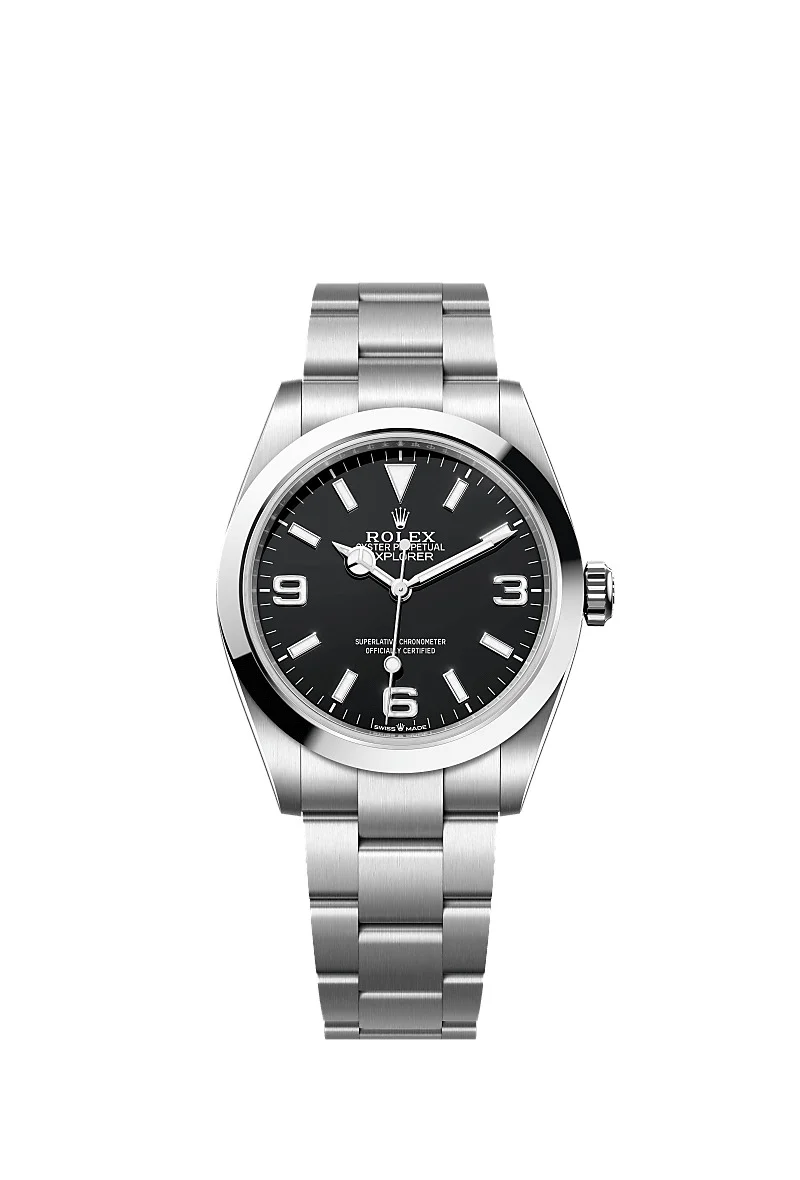 Oyster, 40 mm, Oystersteel Reference224270 The call of the peaks The Oyster PerpetualExplorer 40inOystersteelfeatures a distinctive black dial with characteristic 3, 6, and 9 numerals with a Chromalight display. Black dial Optimal legibility in any situation The dial is the distinctive face of a Rolex watch, the feature most responsible for its identity and readability. The Explorer model’s characteristic 3, 6 and 9 numerals are filled with a luminescent material emitting a long-lasting blue glow, like the hour markers and hands. Like all Rolex timepieces, the Explorer 40's dial is designed and manufactured in-house, largely by hand to ensure perfection. Smooth Bezel An established icon The Oyster Perpetual Explorer 40 imparts a fresh elan to the sober, clean lines that have long established it as an icon. The smooth bezel in Oystersteel is robust yet elegant, and in perfect harmony with the Explorer’s iconic heritage. Oystersteel Highly resistant to corrosion Rolex uses Oystersteel for its steel watch cases. Specially developed by the brand, Oystersteel belongs to the 904L steel family, alloys most commonly used in high-technology and in the aerospace and chemical industries, where maximum resistance to corrosion is essential. Oystersteel is extremely resistant, offers an exceptional finish once polished and maintains its beauty even in the harshest environments. The Oyster bracelet Alchemy of form and function The Oyster bracelet is a perfect alchemy of form and function, aesthetics and technology, designed to be both robust and comfortable. It is equipped with an Oysterlock folding clasp, which prevents accidental opening and the Easylink comfort extension link, also exclusive to Rolex. This ingenious system allows the wearer to increase the bracelet length by approximately 5 mm, providing additional comfort in any circumstance.