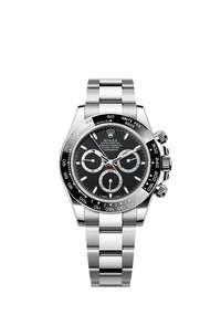 Oyster, 40 mm, Oystersteel Reference126500LN The triumph of endurance The Oyster PerpetualCosmograph DaytonainOystersteelwitha blackdial and contrasting counter rings. It featuresan Oysterbracelet and ablack Cerachrombezel with tachymetric scale. The tachymetric scale High-performance chronograph A key part of the model’s identity is the bezel moulded with a tachymetric scale for measuring average speeds of up to 400 miles or kilometres per hour. Blending high technology with sleek aesthetics, the black bezel is reminiscent of the 1965 model that was fitted with a black Plexiglas bezel insert. The monobloc Cerachrom bezel in high-tech ceramic offers a number of advantages: it is corrosion resistant, virtually scratchproof and the colour is unaffected by UV rays. This extremely durable bezel also offers an exceptionally legible tachymetric scale, thanks to the deposition of a thin layer of platinum in the numerals and graduations via a PVD (Physical Vapour Deposition) process. The monobloc Cerachrom bezel is made in a single piece and holds the crystal firmly in place on the middle case, ensuring waterproofness. Black dial With chronograph counters This model features a black dial with spray-coated counters, 18 ct gold applique hour markers and hands with a Chromalight display, a highly-legible luminescent material. The dial allows drivers to accurately map out their track times and tactics without fail. Oystersteel Highly resistant to corrosion Rolex uses Oystersteel for its steel watch cases. Specially developed by the brand, Oystersteel belongs to the 904L steel family, alloys most commonly used in high-technology and in the aerospace and chemical industries, where maximum resistance to corrosion is essential. Oystersteel is extremely resistant, offers an exceptional finish once polished and maintains its beauty even in the harshest environments. The Oyster bracelet Alchemy of form and function The design, development and production of Rolex bracelets and clasps, as well as the stringent tests they face, involve advanced high technology. And, as with all the components of the watch, aesthetic controls by the human eye guarantee impeccable beauty. The Oyster bracelet is a perfect alchemy of form and function. First introduced in the late 1930s, this particularly robust and comfortable metal bracelet with its broad, flat three-piece links remains the most universal bracelet in the Oyster collection.