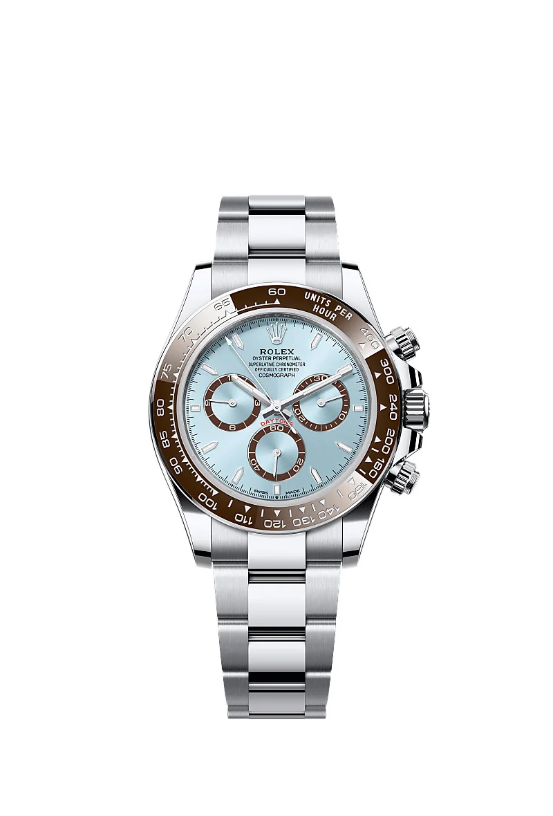 Oyster, 40 mm, platinum Reference126506 The triumph of endurance The Oyster PerpetualCosmograph Daytonainplatinumwithan ice-bluedial and contrasting counter rings. It featuresan Oysterbracelet and achestnut brown Cerachrombezel with tachymetric scale. Ice-Blue Dial With chronograph counters This model features an ice-blue dial with spray-coated counters, 18 ct gold applique hour markers and hands with a Chromalight display, a highly-legible luminescent material. The dial allows drivers to accurately map out their track times and tactics without fail. The tachymetric scale High-performance chronograph A key part of the model’s identity is the bezel moulded with a tachymetric scale for measuring average speeds of up to 400 miles or kilometres per hour. The monobloc Cerachrom bezel in high-tech ceramic offers a number of advantages: it is corrosion resistant, virtually scratchproof and the colour is unaffected by UV rays. This extremely durable bezel also offers an exceptionally legible tachymetric scale, thanks to the deposition of a thin layer of platinum in the numerals and graduations via a PVD (Physical Vapour Deposition) process. The monobloc Cerachrom bezel is made in a single piece and holds the crystal firmly in place on the middle case, ensuring waterproofness. Platinum The noblest of metals Rare and precious, platinum is striking for its silvery whiteness and vibrant luminosity. It is among the densest and heaviest metals in the world, distinguished by unique chemical and physical properties such as exceptional corrosion resistance. Paradoxically, it is also soft, elastic and highly malleable, which makes machining and polishing especially difficult, demanding an extremely high degree of skill. Rolex always uses 950 platinum, an alloy consisting of 950‰ (thousandths) platinum, painstakingly crafted in-house by the fine metalworkers at Rolex. The noblest of metals for the finest of watches. The Oyster bracelet Alchemy of form and function The design, development and production of Rolex bracelets and clasps, as well as the stringent tests they face, involve advanced high technology. And, as with all the components of the watch, aesthetic controls by the human eye guarantee impeccable beauty. The Oyster bracelet is a perfect alchemy of form and function. First introduced in the late 1930s, this particularly robust and comfortable metal bracelet with its broad, flat three-piece links remains the most universal bracelet in the Oyster collection.