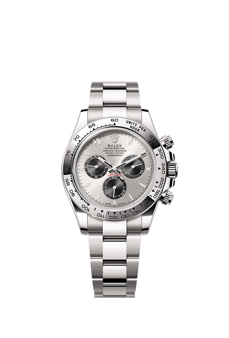 Oyster, 40 mm, white gold Reference126509 The triumph of endurance This Oyster PerpetualCosmograph Daytonain18 ct white gold, witha steel and bright blackdial andan Oysterbracelet, featuresan 18 ct white goldbezel with an engraved tachymetric scale. The tachymetric scale High-performance chronograph With its tachymetric scale, its three counters and its pushers, the Cosmograph Daytona was designed to be the ultimate timing tool for endurance racing drivers. The bezel features a tachymetric scale to read average speed over a given distance based on elapsed time. This scale offers optimal legibility, making the Cosmograph Daytona the ideal instrument for measuring speeds up to 400 units per hour, expressed in kilometres or miles. Steel and bright black dial With chronograph counters This model features a steel and bright black dial with snailed counters, 18 ct gold applique hour markers and hands with a Chromalight display, a highly-legible luminescent material. The dial allows drivers to accurately map out their track times and tactics without fail. 18 ct white gold Commitment to excellence By operating its own exclusive foundry, Rolex has the unrivalled ability to cast the highest quality 18 ct gold alloys. According to the proportion of silver, copper, platinum or palladium added, different types of 18 ct gold are obtained: yellow, pink or white. They are made with only the purest metals and meticulously inspected in an in-house laboratory with state-of-the-art equipment, before the gold is formed and shaped with the same painstaking attention to quality. Rolex's commitment to excellence begins at the source. The Oyster bracelet Alchemy of form and function The design, development and production of Rolex bracelets and clasps, as well as the stringent tests they face, involve advanced high technology. And, as with all the components of the watch, aesthetic controls by the human eye guarantee impeccable beauty. The Oyster bracelet is a perfect alchemy of form and function. First introduced in the late 1930s, this particularly robust and comfortable metal bracelet with its broad, flat three-piece links remains the most universal bracelet in the Oyster collection.