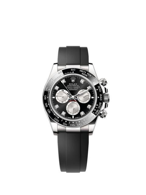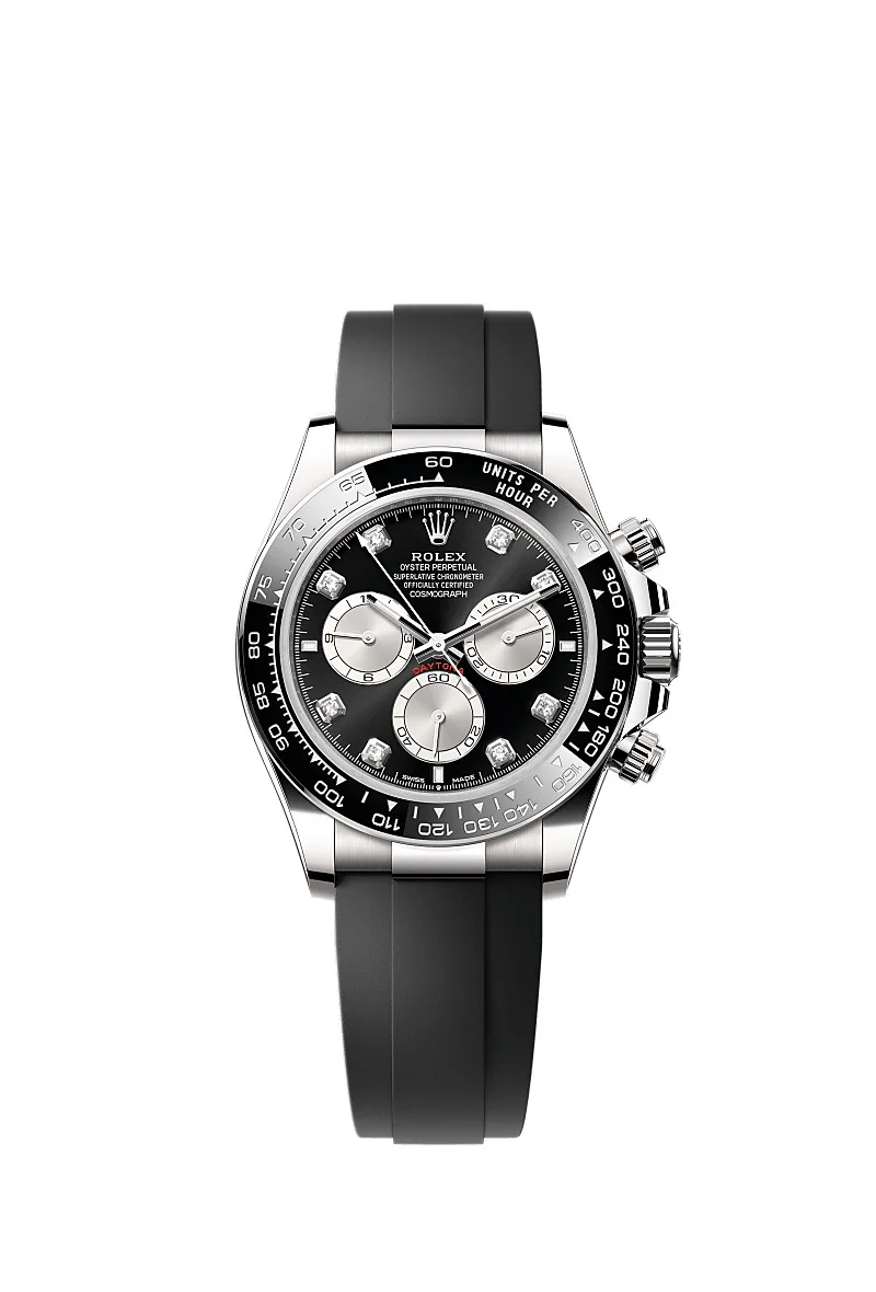 Oyster, 40 mm, white gold Reference126519LN The triumph of endurance This Oyster PerpetualCosmograph Daytonain18 ct white gold, witha bright black and steel, diamond-setdial andan Oysterflexbracelet, features ablack Cerachrombezel with tachymetric scale. The Oysterflex Bracelet Highly resistant and durable The 18 ct gold versions of the Cosmograph Daytona with a Cerachrom bezel are available with an Oysterflex bracelet. Developed by Rolex and patented, it singularly combines the robustness of a metal bracelet with the comfort of an elastomer bracelet. It is made up of two flexible curved metal blades – one in each bracelet section – overmoulded with high-performance black elastomer. For optimum comfort, the Oysterflex bracelet is equipped with cushions on its inner sides and an Oysterlock safety clasp to prevent accidental opening. Its length may be adjusted via the ingenious Rolex Glidelock extension system. 18 ct white gold Commitment to excellence By operating its own exclusive foundry, Rolex has the unrivalled ability to cast the highest quality 18 ct gold alloys. According to the proportion of silver, copper, platinum or palladium added, different types of 18 ct gold are obtained: yellow, pink or white. They are made with only the purest metals and meticulously inspected in an in-house laboratory with state-of-the-art equipment, before the gold is formed and shaped with the same painstaking attention to quality. Rolex's commitment to excellence begins at the source. Bright black and steel dial With chronograph counters This model features a bright black and steel, diamond-set dial with spray-coated counters, 18 ct gold applique hour markers and hands with a Chromalight display, a highly-legible luminescent material. The dial allows drivers to accurately map out their track times and tactics without fail. The tachymetric scale High-performance chronograph A key part of the model’s identity is the bezel moulded with a tachymetric scale for measuring average speeds of up to 400 miles or kilometres per hour. Blending high technology with sleek aesthetics, the black bezel is reminiscent of the 1965 model that was fitted with a black Plexiglas bezel insert. The monobloc Cerachrom bezel in high-tech ceramic offers a number of advantages: it is corrosion resistant, virtually scratchproof and the colour is unaffected by UV rays. This extremely durable bezel also offers an exceptionally legible tachymetric scale, thanks to the deposition of a thin layer of platinum in the numerals and graduations via a PVD (Physical Vapour Deposition) process. The monobloc Cerachrom bezel is made in a single piece and holds the crystal firmly in place on the middle case, ensuring waterproofness.