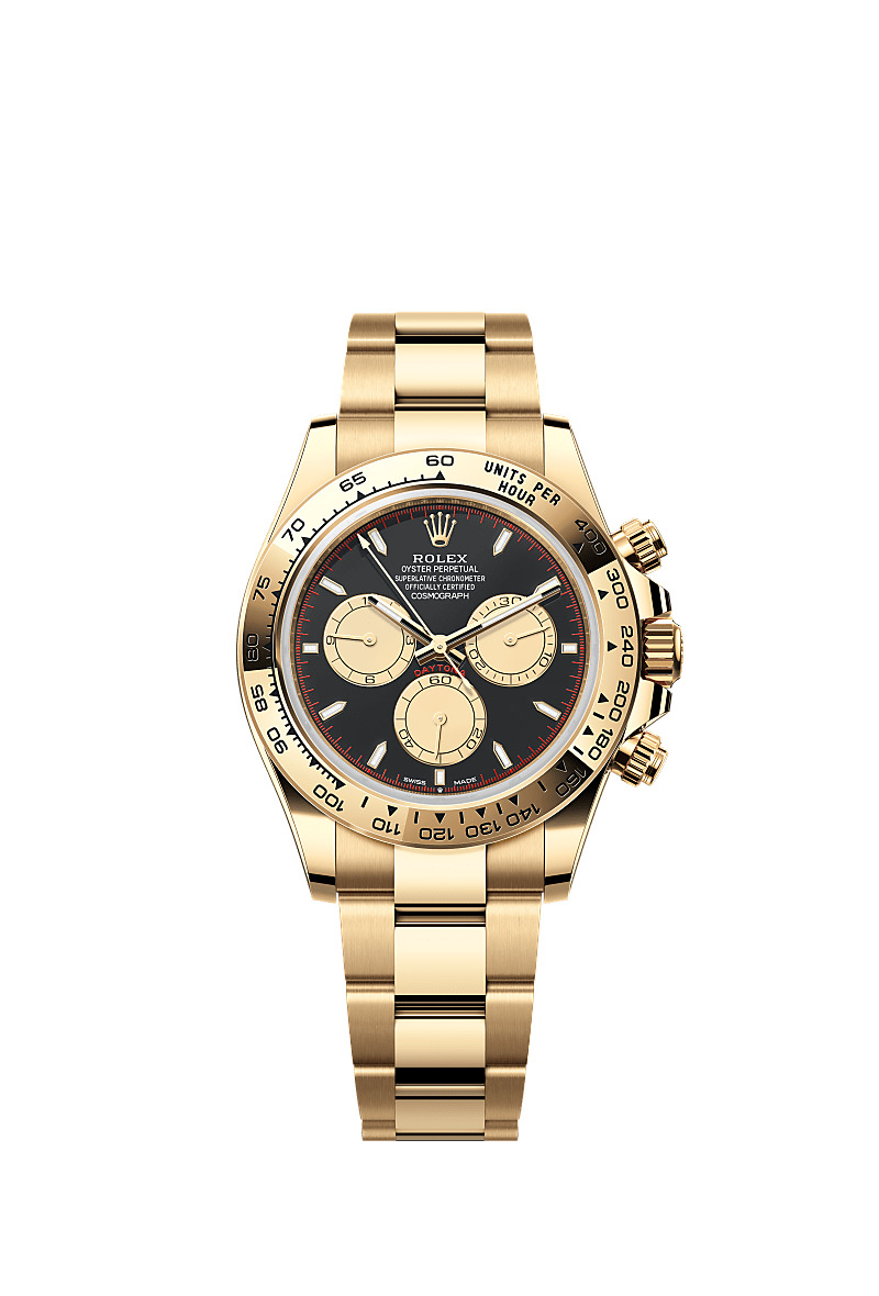 Oyster, 40 mm, yellow gold Reference126508 The triumph of endurance This Oyster PerpetualCosmograph Daytonain18 ct yellow gold, withan intense black and champagne-colourdial andan Oysterbracelet, featuresan 18 ct yellow goldbezel with an engraved tachymetric scale. The tachymetric scale High-performance chronograph With its tachymetric scale, its three counters and its pushers, the Cosmograph Daytona was designed to be the ultimate timing tool for endurance racing drivers. The bezel features a tachymetric scale to read average speed over a given distance based on elapsed time. This scale offers optimal legibility, making the Cosmograph Daytona the ideal instrument for measuring speeds up to 400 units per hour, expressed in kilometres or miles. Intense black and Champagne-colour dial With chronograph counters This model features an intense black and champagne-colour dial with spray-coated counters, 18 ct gold applique hour markers and hands with a Chromalight display, a highly-legible luminescent material. The dial allows drivers to accurately map out their track times and tactics without fail. 18 ct yellow gold Commitment to excellence By operating its own exclusive foundry, Rolex has the unrivalled ability to cast the highest quality 18 ct gold alloys. According to the proportion of silver, copper, platinum or palladium added, different types of 18 ct gold are obtained: yellow, pink or white. They are made with only the purest metals and meticulously inspected in an in-house laboratory with state-of-the-art equipment, before the gold is formed and shaped with the same painstaking attention to quality. Rolex's commitment to excellence begins at the source. The Oyster bracelet Alchemy of form and function The design, development and production of Rolex bracelets and clasps, as well as the stringent tests they face, involve advanced high technology. And, as with all the components of the watch, aesthetic controls by the human eye guarantee impeccable beauty. The Oyster bracelet is a perfect alchemy of form and function. First introduced in the late 1930s, this particularly robust and comfortable metal bracelet with its broad, flat three-piece links remains the most universal bracelet in the Oyster collection.