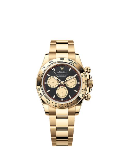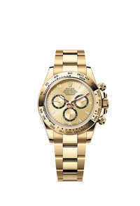 Oyster, 40 mm, yellow gold Reference126508 The triumph of endurance The Oyster PerpetualCosmograph Daytonain18 ct yellow goldwitha goldendial and contrasting counter rings. It featuresan Oysterbracelet andan 18 ct yellow goldbezel with an engraved tachymetric scale. The tachymetric scale High-performance chronograph With its tachymetric scale, its three counters and its pushers, the Cosmograph Daytona was designed to be the ultimate timing tool for endurance racing drivers. The bezel features a tachymetric scale to read average speed over a given distance based on elapsed time. This scale offers optimal legibility, making the Cosmograph Daytona the ideal instrument for measuring speeds up to 400 units per hour, expressed in kilometres or miles. Golden dial With chronograph counters This model features a golden dial with snailed counters, 18 ct gold applique hour markers and hands with a Chromalight display, a highly-legible luminescent material. The dial allows drivers to accurately map out their track times and tactics without fail. 18 ct yellow gold Commitment to excellence By operating its own exclusive foundry, Rolex has the unrivalled ability to cast the highest quality 18 ct gold alloys. According to the proportion of silver, copper, platinum or palladium added, different types of 18 ct gold are obtained: yellow, pink or white. They are made with only the purest metals and meticulously inspected in an in-house laboratory with state-of-the-art equipment, before the gold is formed and shaped with the same painstaking attention to quality. Rolex's commitment to excellence begins at the source. The Oyster bracelet Alchemy of form and function The design, development and production of Rolex bracelets and clasps, as well as the stringent tests they face, involve advanced high technology. And, as with all the components of the watch, aesthetic controls by the human eye guarantee impeccable beauty. The Oyster bracelet is a perfect alchemy of form and function. First introduced in the late 1930s, this particularly robust and comfortable metal bracelet with its broad, flat three-piece links remains the most universal bracelet in the Oyster collection.