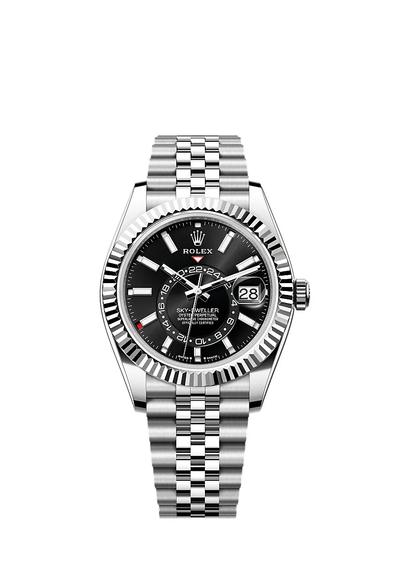 Oyster, 42 mm, Oystersteel and white gold Reference336934 High-flying The Oyster PerpetualSky-DwellerinOystersteel and white goldwitha bright blackdial anda Jubileebracelet. Bright black dial A striking characteristic A fixed inverted red triangle on the dial points to the chosen reference time – the time at home or at the traveller’s usual workplace – on the off-centre 24-hour disc. At a glance, this 24-hour display clearly distinguishes daytime hours from night-time hours in the other time zone. A deep red rectangle in one of the 12 windows around the dial indicates the current month, a striking characteristic of the Saros annual calendar. This ingenious mechanism simplifies life for the wearer of the watch, who no longer needs to think about adjusting the date at the end of a 30-day month. The annual calendar displays the correct date through the year. Only one adjustment is needed – on 1 March (February having only 28 or 29 days). The date is connected to local time and automatically changes according to the traveller’s local time zone. The Fluted Bezel A Rolex signature The Rolex fluted bezel is a mark of distinction. Originally, the fluting of the Oyster bezel had a functional purpose: it served to screw the bezel onto the case, helping to ensure the waterproofness of the watch. It was therefore identical to the fluting on the case back, which was also screwed onto the case for waterproofness, using specific Rolex tools. Over time, the fluting became an aesthetic element, a genuine Rolex signature feature. Today the fluted bezel is a mark of distinction, always in gold. The Sky-Dweller is equipped with a mechanism of interaction between the rotatable bezel, the winding crown and the movement: the Ring Command system, which allows the user to select the watch's functions one-by-one and to set them easily, quickly and securely. White Rolesor A meeting of two metals Gold is coveted for its lustre and nobility. Steel reinforces strength and reliability. Together, they harmoniously combine the best of their properties. A true Rolex signature, Rolesor has featured on Rolex models since the early 1930s, and was trademarked as a name in 1933. It is one of the prominent pillars of the Oyster collection. The Jubilee bracelet Supple and comfortable Supple and comfortable, this five-piece link metal bracelet was specially created for the Oyster Perpetual Datejust, which was launched in 1945. The Jubilee bracelet on these watches is equipped with a folding Oysterclasp and features the Easylink comfort extension link, developed by Rolex, which allows the wearer to easily adjust the bracelet length by approximately 5 mm. The bracelet also includes patented ceramic inserts – designed by the brand – inside the links to enhance its flexibility on the wrist and its longevity.