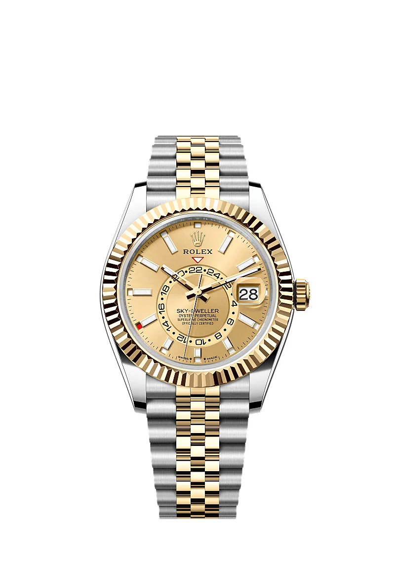 Oyster, 42 mm, Oystersteel and yellow gold Reference336933 High-flying The Oyster PerpetualSky-DwellerinOystersteel and yellow goldwitha champagne-colourdial anda Jubileebracelet. Champagne-colour dial A striking characteristic A fixed inverted red triangle on the dial points to the chosen reference time – the time at home or at the traveller’s usual workplace – on the off-centre 24-hour disc. At a glance, this 24-hour display clearly distinguishes daytime hours from night-time hours in the other time zone. A deep red rectangle in one of the 12 windows around the dial indicates the current month, a striking characteristic of the Saros annual calendar. This ingenious mechanism simplifies life for the wearer of the watch, who no longer needs to think about adjusting the date at the end of a 30-day month. The annual calendar displays the correct date through the year. Only one adjustment is needed – on 1 March (February having only 28 or 29 days). The date is connected to local time and automatically changes according to the traveller’s local time zone. The Fluted Bezel A Rolex signature The Rolex fluted bezel is a mark of distinction. Originally, the fluting of the Oyster bezel had a functional purpose: it served to screw the bezel onto the case, helping to ensure the waterproofness of the watch. It was therefore identical to the fluting on the case back, which was also screwed onto the case for waterproofness, using specific Rolex tools. Over time, the fluting became an aesthetic element, a genuine Rolex signature feature. Today the fluted bezel is a mark of distinction, always in gold. The Sky-Dweller is equipped with a mechanism of interaction between the rotatable bezel, the winding crown and the movement: the Ring Command system, which allows the user to select the watch's functions one-by-one and to set them easily, quickly and securely. Yellow Rolesor A meeting of two metals Gold is coveted for its lustre and nobility. Steel reinforces strength and reliability. Together, they harmoniously combine the best of their properties. A true Rolex signature, Rolesor has featured on Rolex models since the early 1930s, and was trademarked as a name in 1933. It is one of the prominent pillars of the Oyster collection. The Jubilee bracelet Supple and comfortable Supple and comfortable, this five-piece link metal bracelet was specially created for the Oyster Perpetual Datejust, which was launched in 1945. The Jubilee bracelet on these watches is equipped with a folding Oysterclasp and features the Easylink comfort extension link, developed by Rolex, which allows the wearer to easily adjust the bracelet length by approximately 5 mm. The bracelet also includes patented ceramic inserts – designed by the brand – inside the links to enhance its flexibility on the wrist and its longevity.